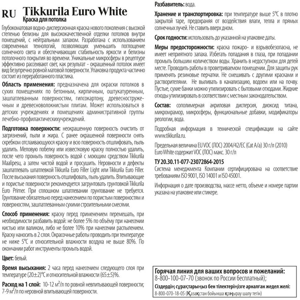 Tikkurila Euro White Безупречный потолок, краска для потолка, глубокоматовая, белая 2,7 49857 .