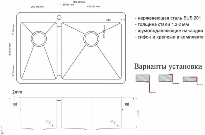Мойка для кухни ZorG ZL R 780-2-440 GRAFIT оборачиваемая, графит черная, две чаши интересное: