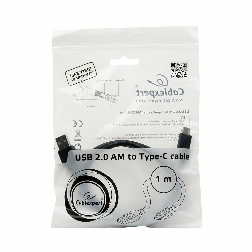 Кабель Cablexpert USB , USB2.0 AM/USB Type-C, 1м, пакет