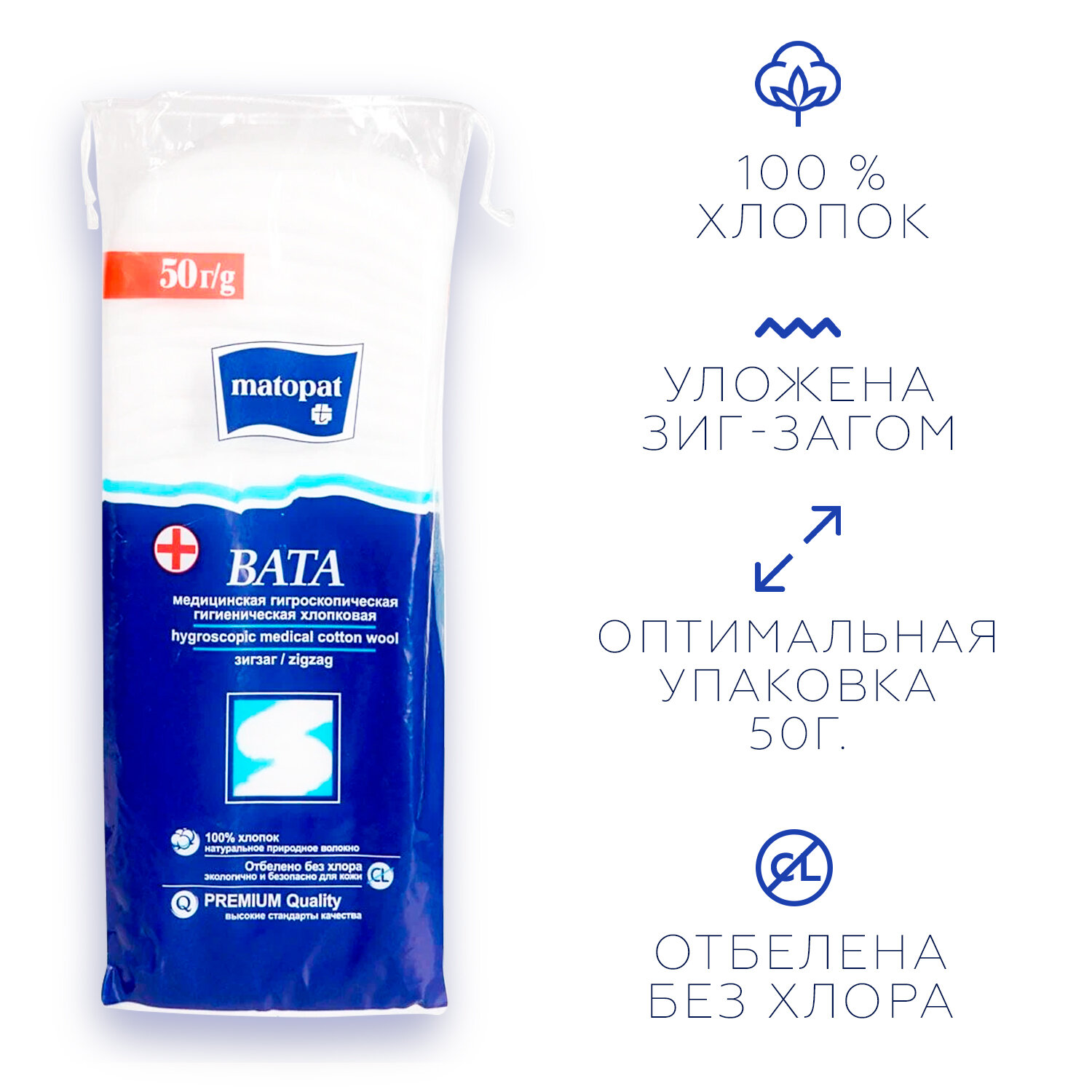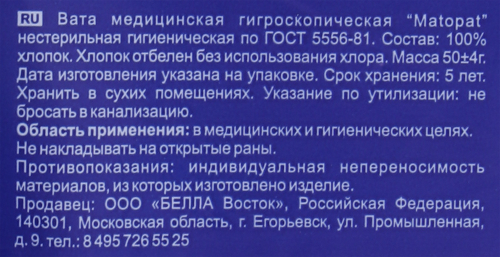 Перевязочные материалы тзмо/Белла ООО Вата гигиен гигроск н/стерил 50 г Matopat (сложение Зиг-Заг)