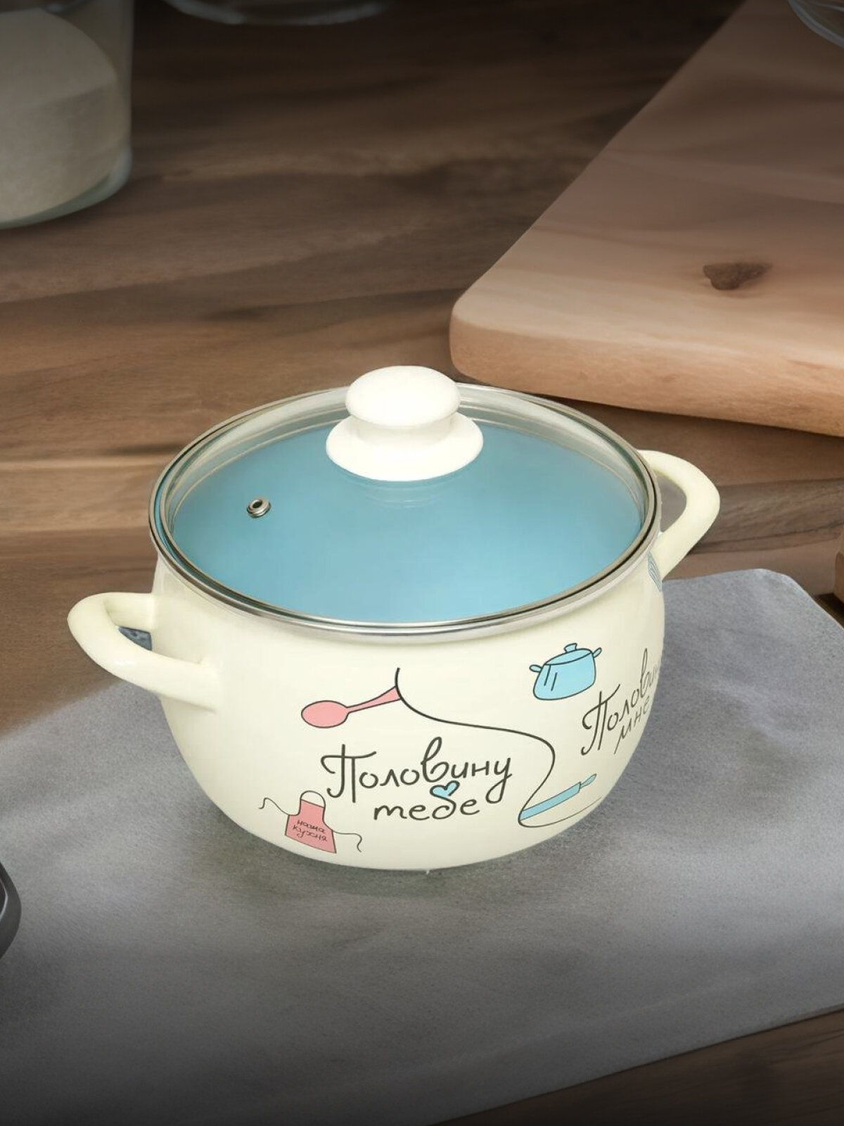 Кастрюля глубокая эмалированная со стеклянной крышкой, 4 л, Половинки