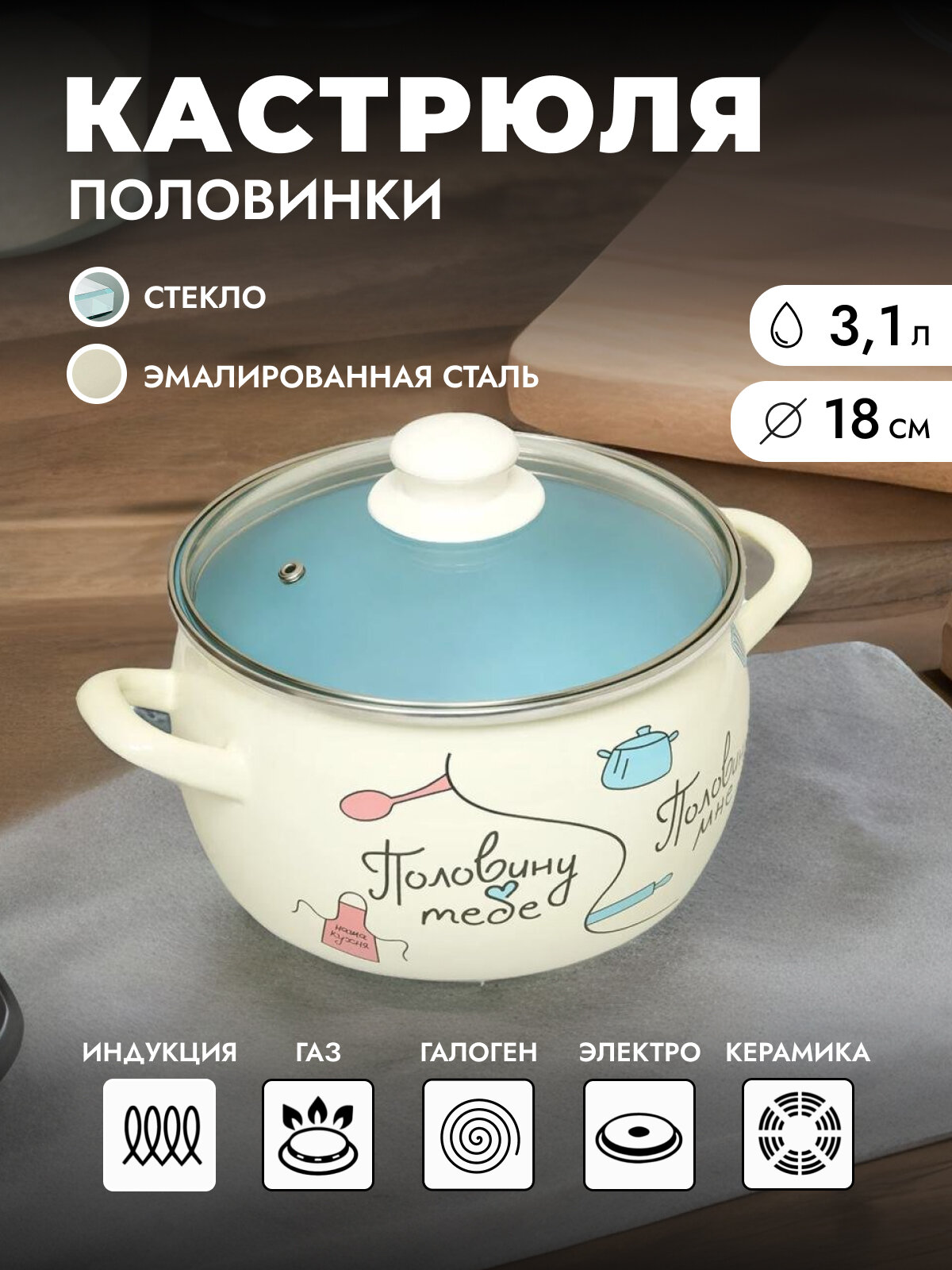 Кастрюля глубокая эмалированная со стеклянной крышкой, 3,1 л, Половинки