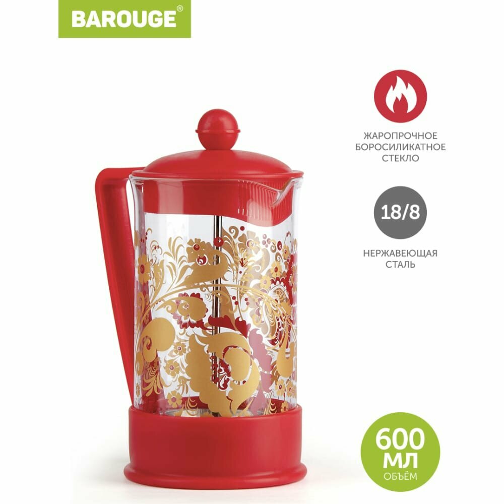Френч-пресс BAROUGE BF-728/30 Viva la Vida "Хохлома", стеклянный, красный, с принтом, 600 мл BF-728 600 мл/красный/фрэнч