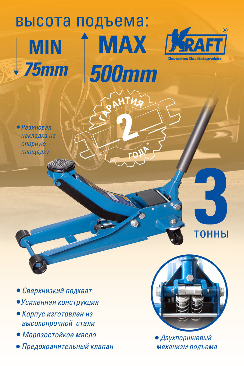 KRAFT KT820007 Домкрат подкатной гидравлический с двухпоршневым механизмом подъема 3 т. 75-500 мм