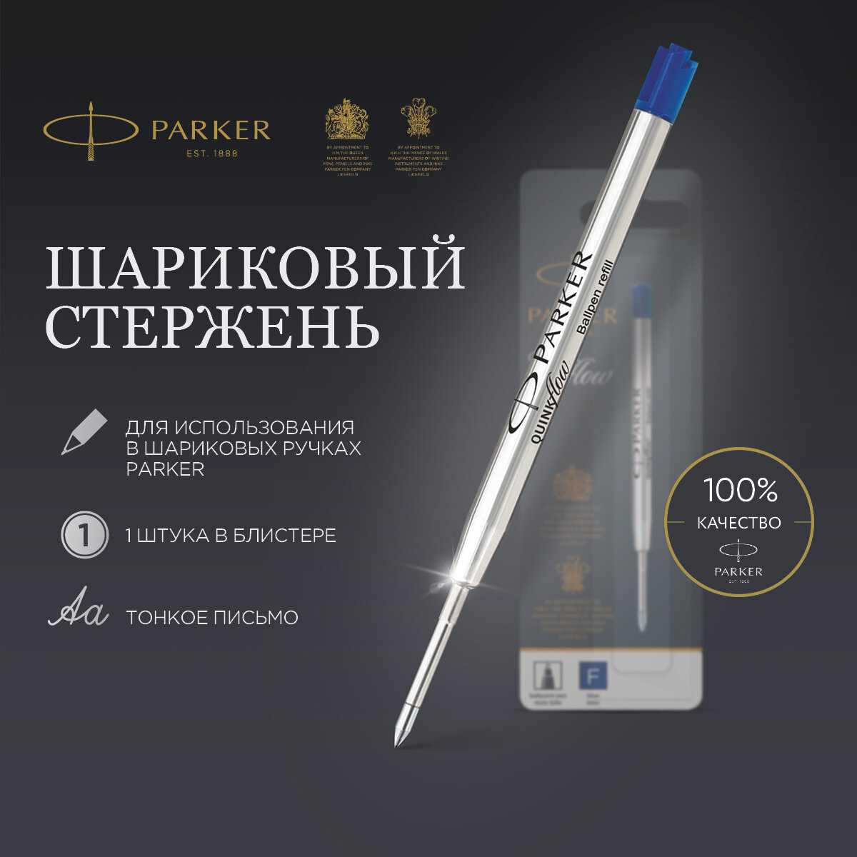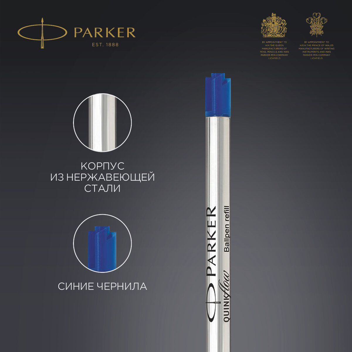 Стержень шариковый PARKER "Quinkflow", металлический, 98 мм, узел 0,8 мм, блистер, синий, 1950368 В комплекте: 1шт.