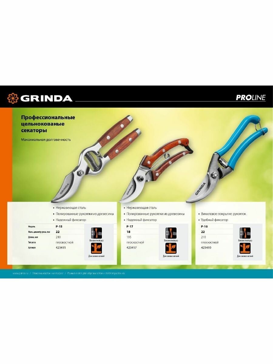 GRINDA P-15 210 мм, из нержавеющей стали, с деревянными рукоятками, Цельнокованый плоскостной секатор, PROLine (423415)