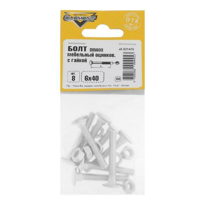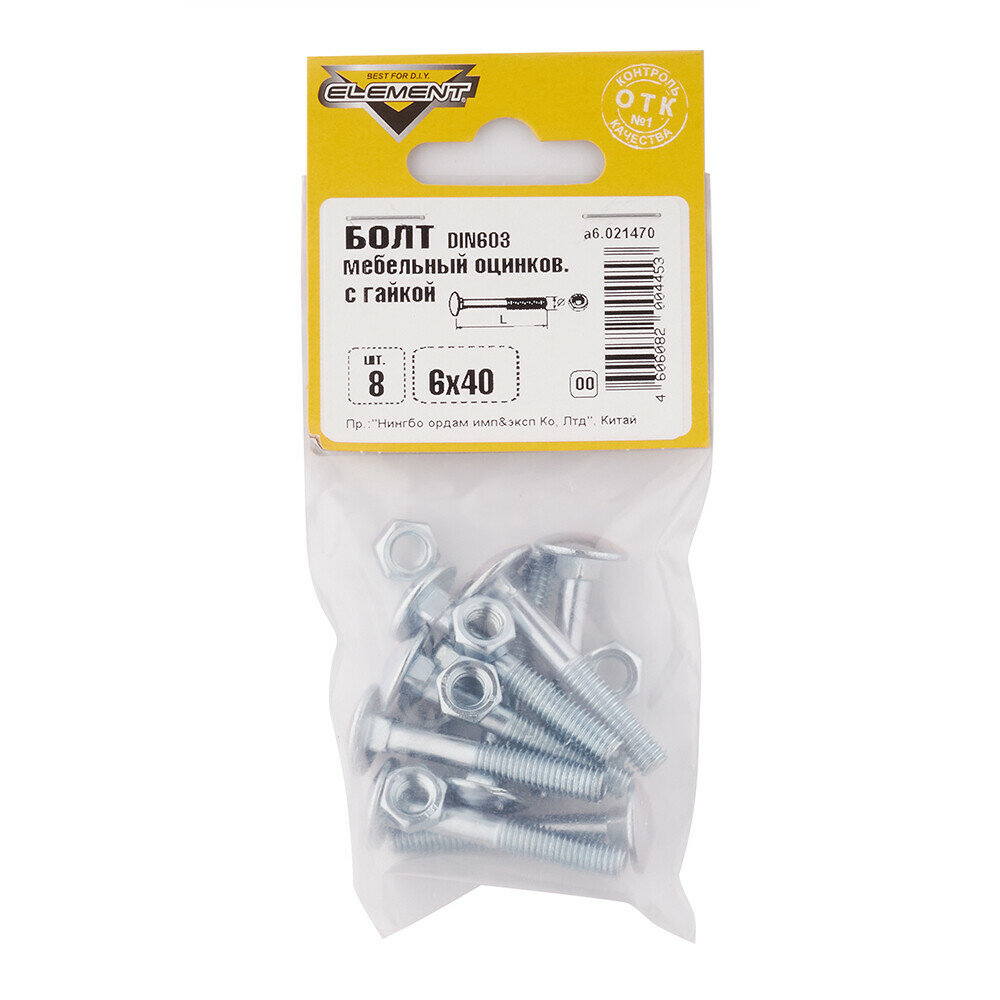 Болт мебельный Element, DIN603, 6х40 мм, с гайкой, оцинкованный, на блистере 8 шт.