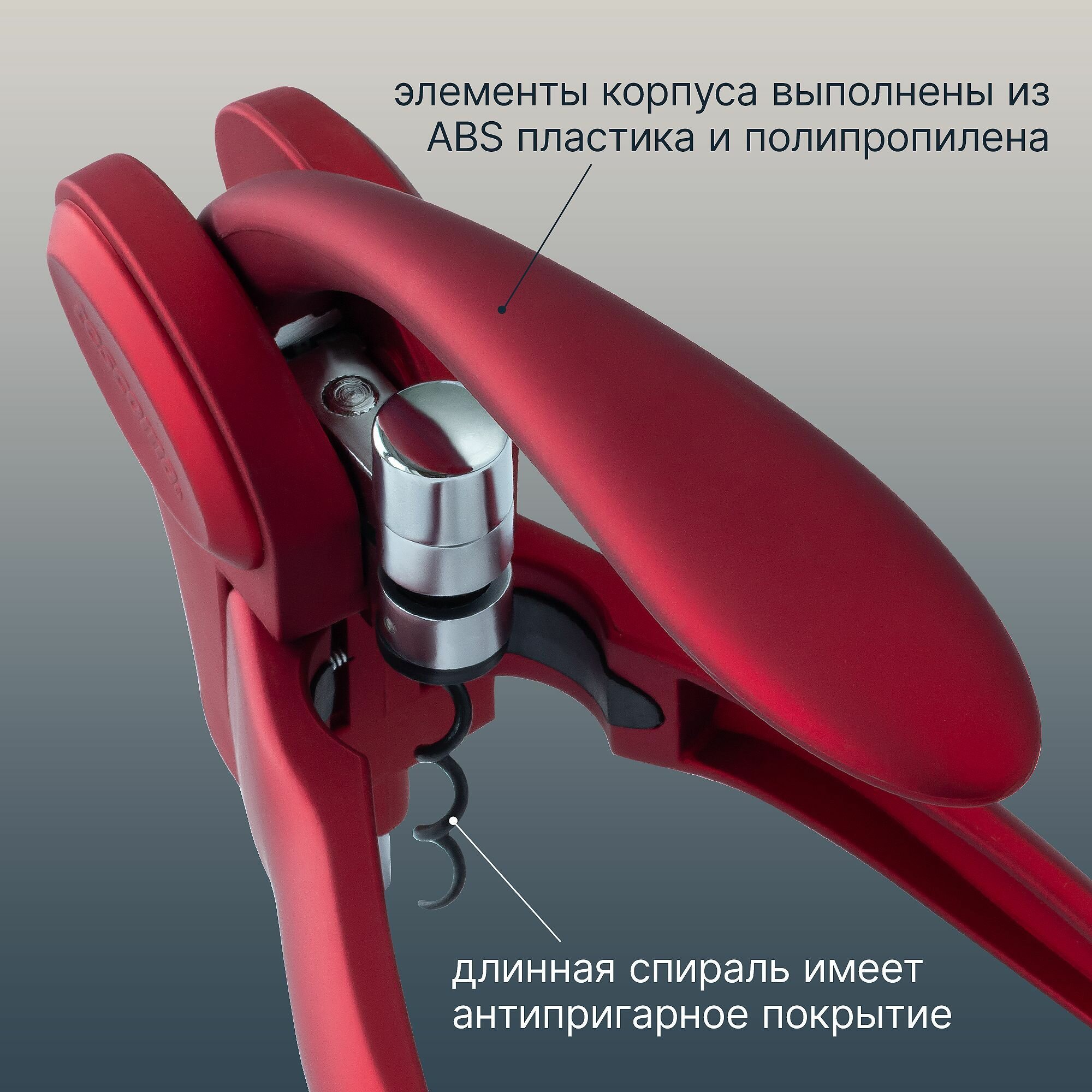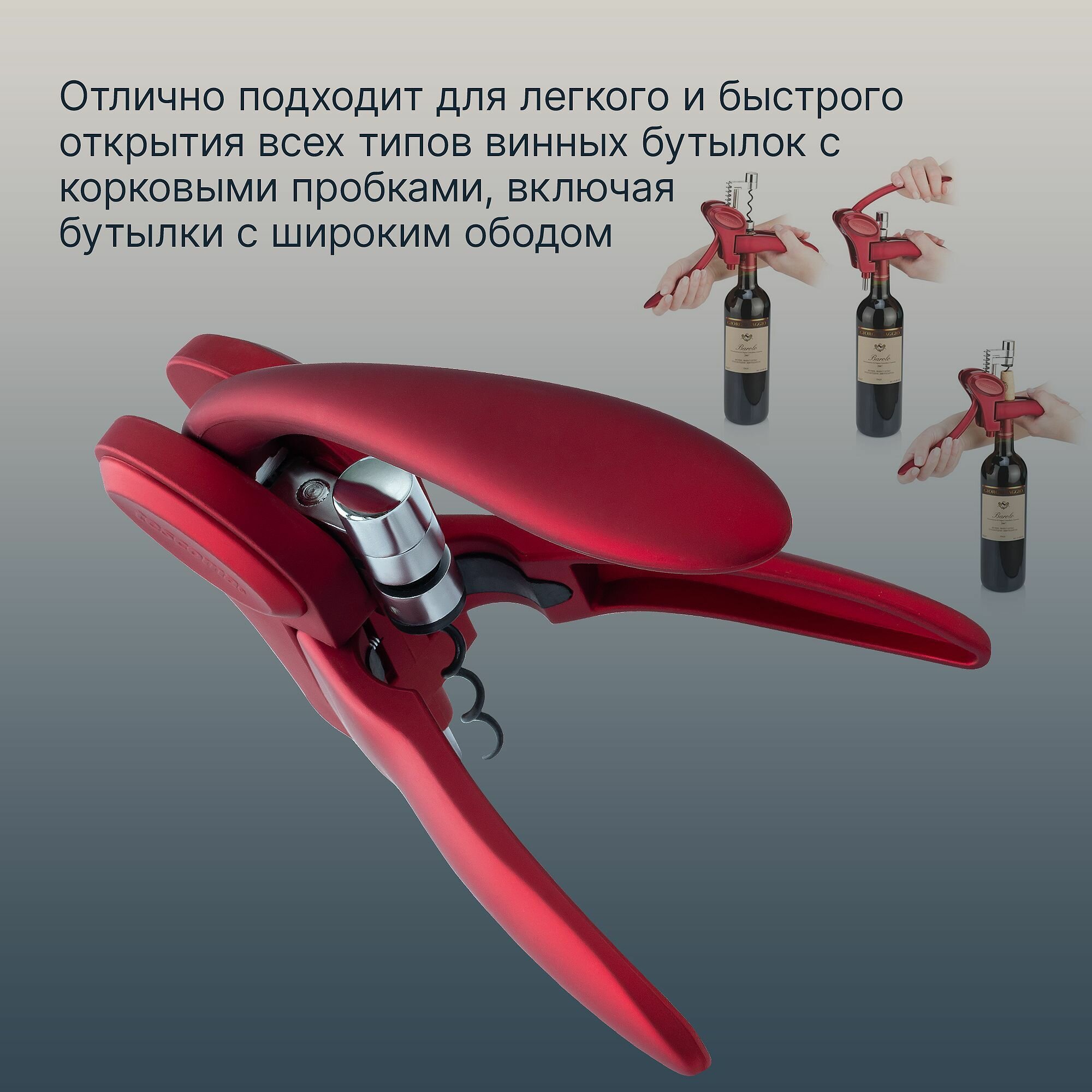 | Плюсы: | изящно открывает вино в 4 движения - вниз вверх вниз вверх и бутылка открыта, пробка лежит на столе, прикладываешь минимум усилий |