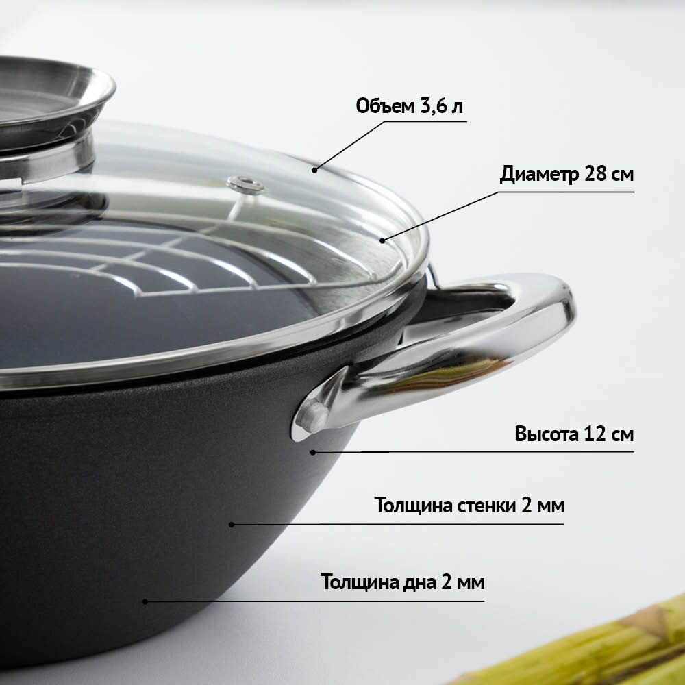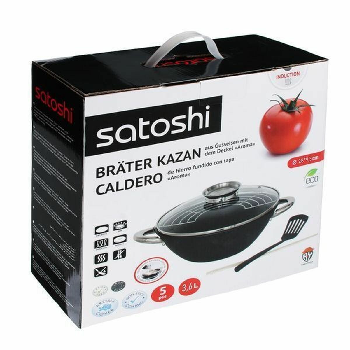 Казан 3,6л 28см (чугун) аП нержавеющая сталь/руч, решетка, стекляная крышка, нейл.лопатка, бамб.пал. Satoshi