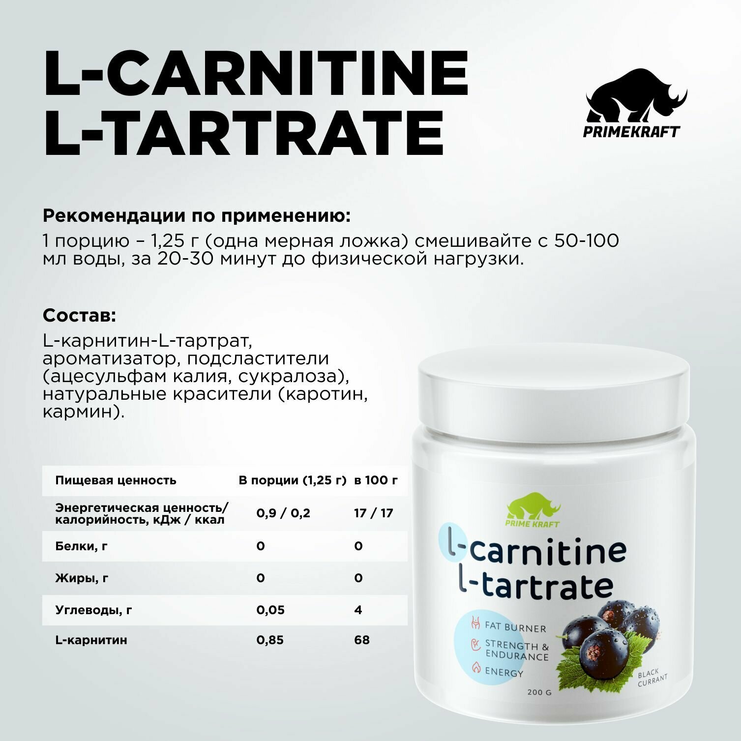 Купить Л-Карнитин тартрат Prime Kraft 200 г, порошок (Черная смородина)