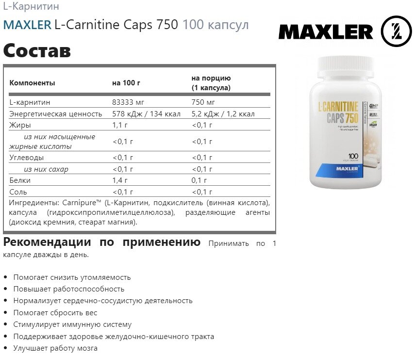 Ниже Вы можете прочитать отзывы на L-Карнитин L-Carnitine 750 мг 100 капс аминокислота для снижения усталости и повышения иммунитета (Maxler), ознакомится с подробными характеристиками, посмотреть интересные обзоры и фотографии на L-Карнитин L-Carnitine 750 мг 100 капс аминокислота для снижения усталости и повышения иммунитета (Maxler).