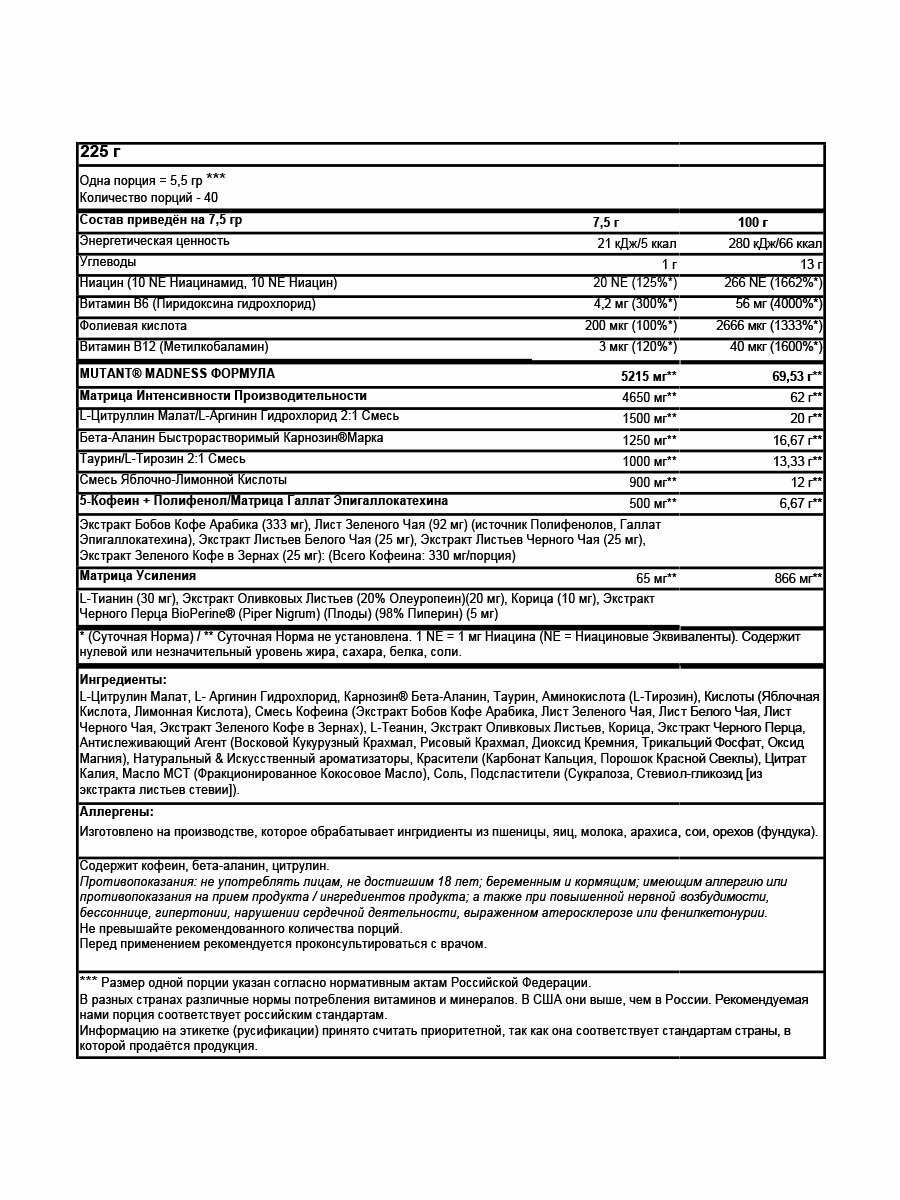 Предтренировочный комплекс Mutant Madness 225 гр Голубая Малина "Внутри продукта находится пакет с влагоудерживающим агентом. Будьте внимательны!"