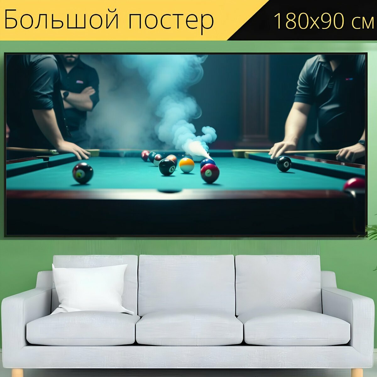 Большой постер в бильярдную "Игроки в бильярд, окруженные дымом" 180 x 90 см. для интерьера на стену интересное: