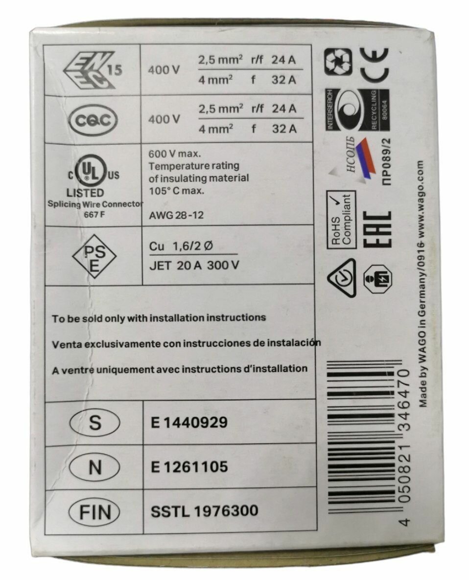 WAGO Клемма WAGO Оригинал 4-проводная 2273-204 (0,5-2,5 мм2, без пасты) 30 шт.