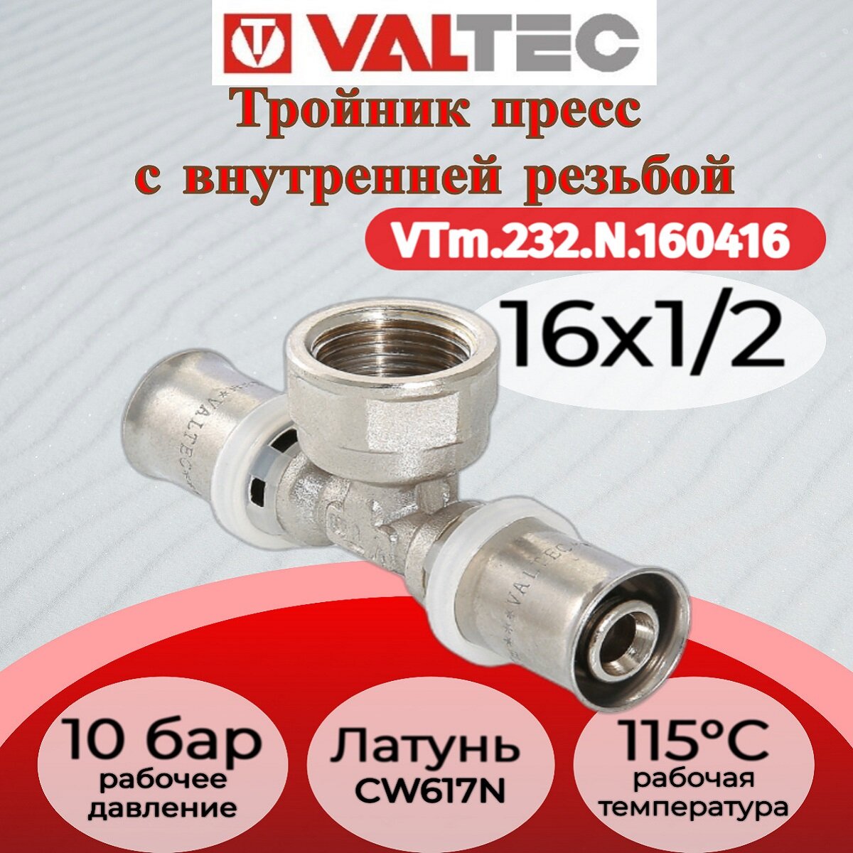 Тройник пресс с переходом на внутреннюю резьбу 16х1/2"х16 VALTEC VTm.232.N.160416