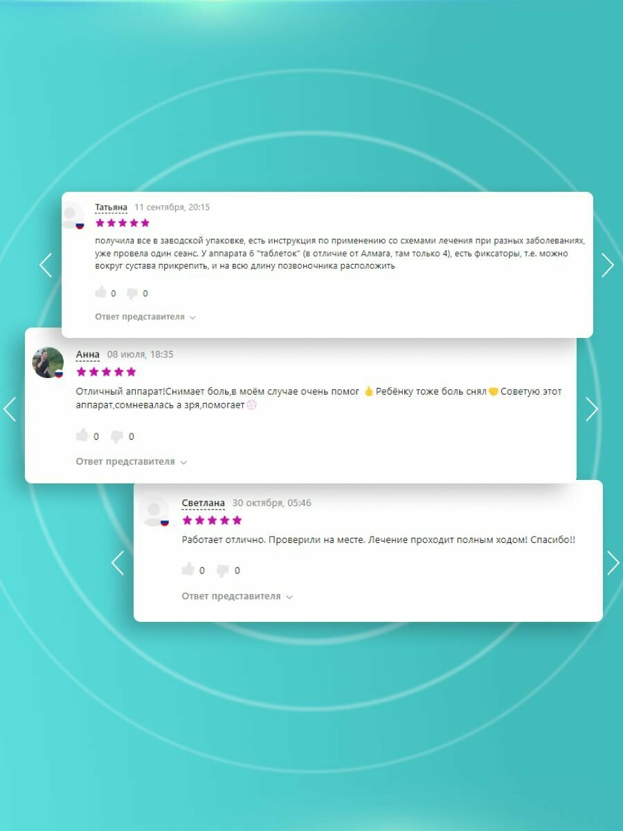 | Отзыв: | Очень сильно прихватило спину. Вынуждена была купить аппарат для процедур, так как ходить в поликлинику не могла. Стоит дешевле Алмага, а смысл тот же. Мне магнитотерапия очень помогает. Спасибо. |
