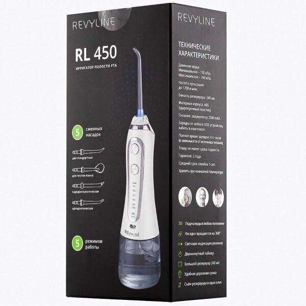 Ирригатор для полости рта REVYLINE RL 450, портативный, емкость резервуара 0,24 л, 5 насадок, белый