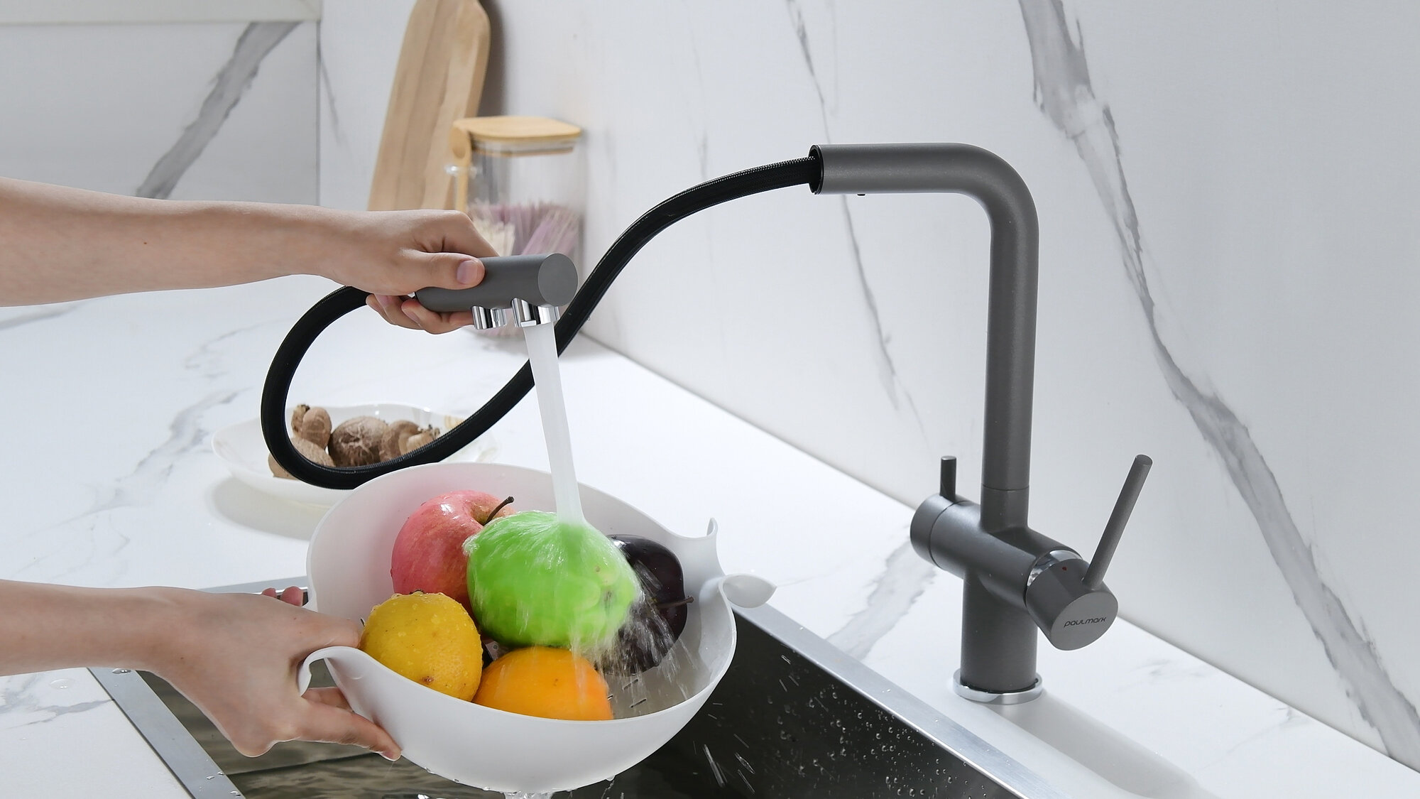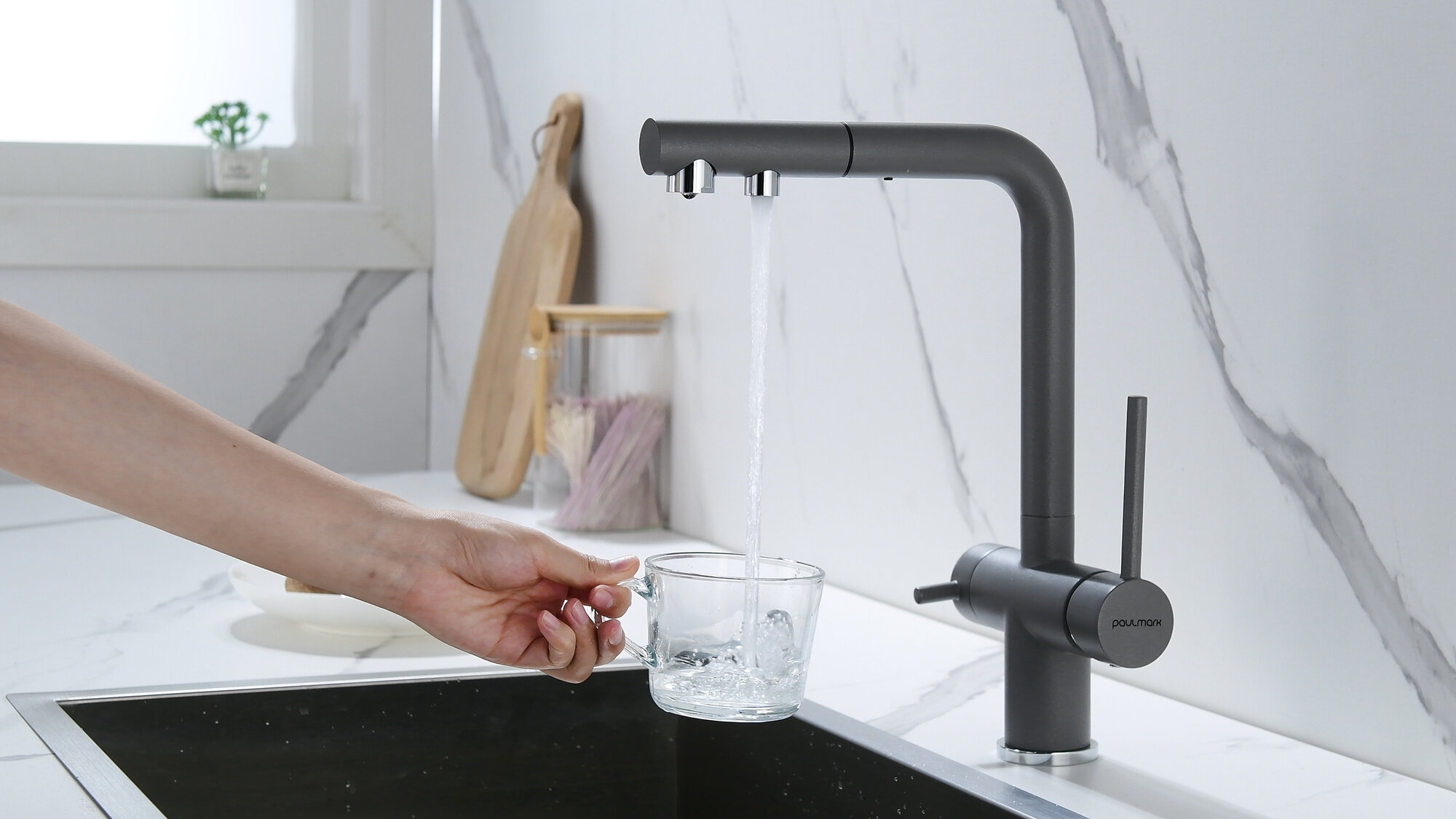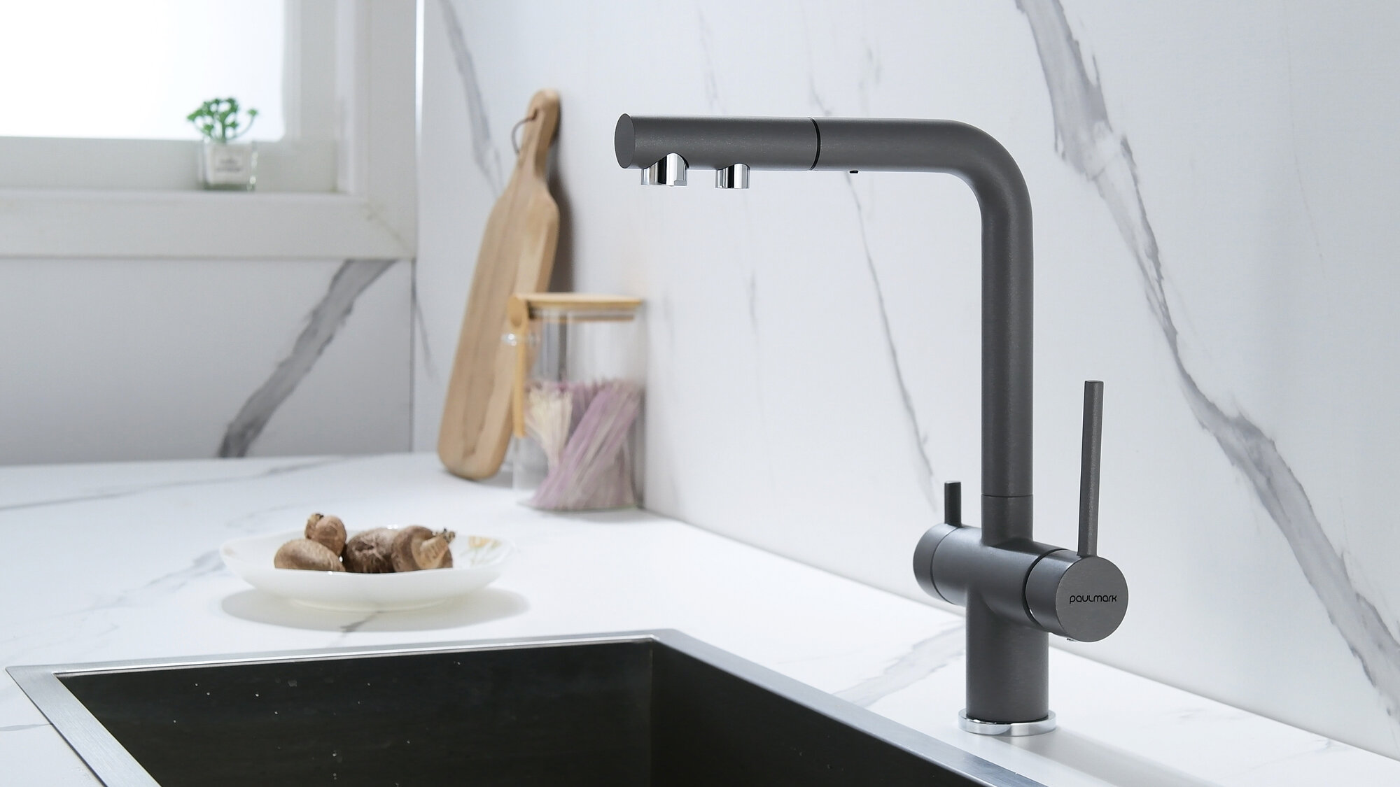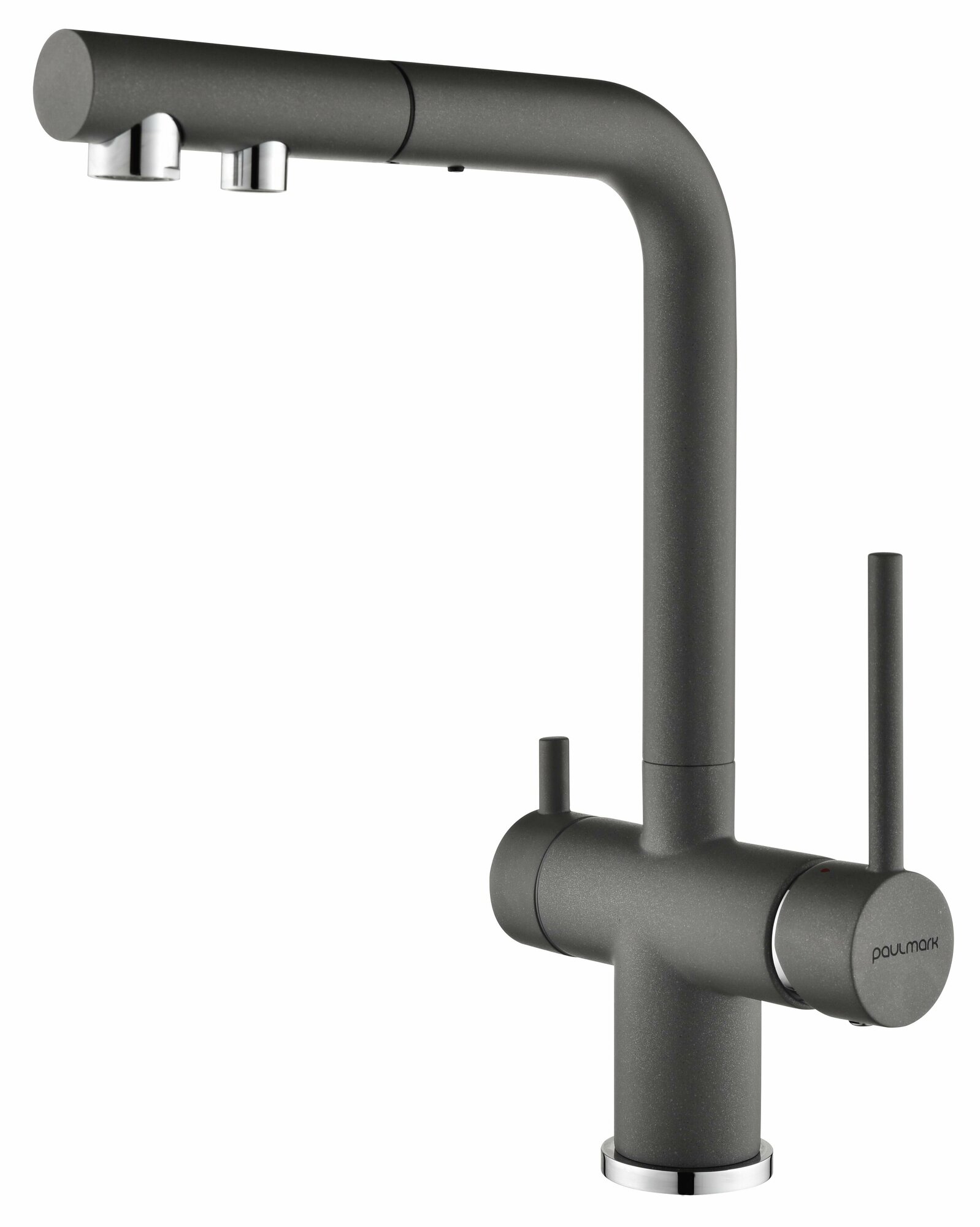 Кухонный смеситель с гибким выдвижным изливом Paulmark SERPENTINE, подключение к системе фильтрации воды по отдельному каналу, Г-образный, латунь, на мойку / столешницу, графит, Se213222-DG