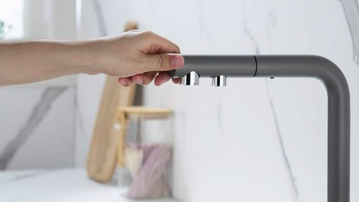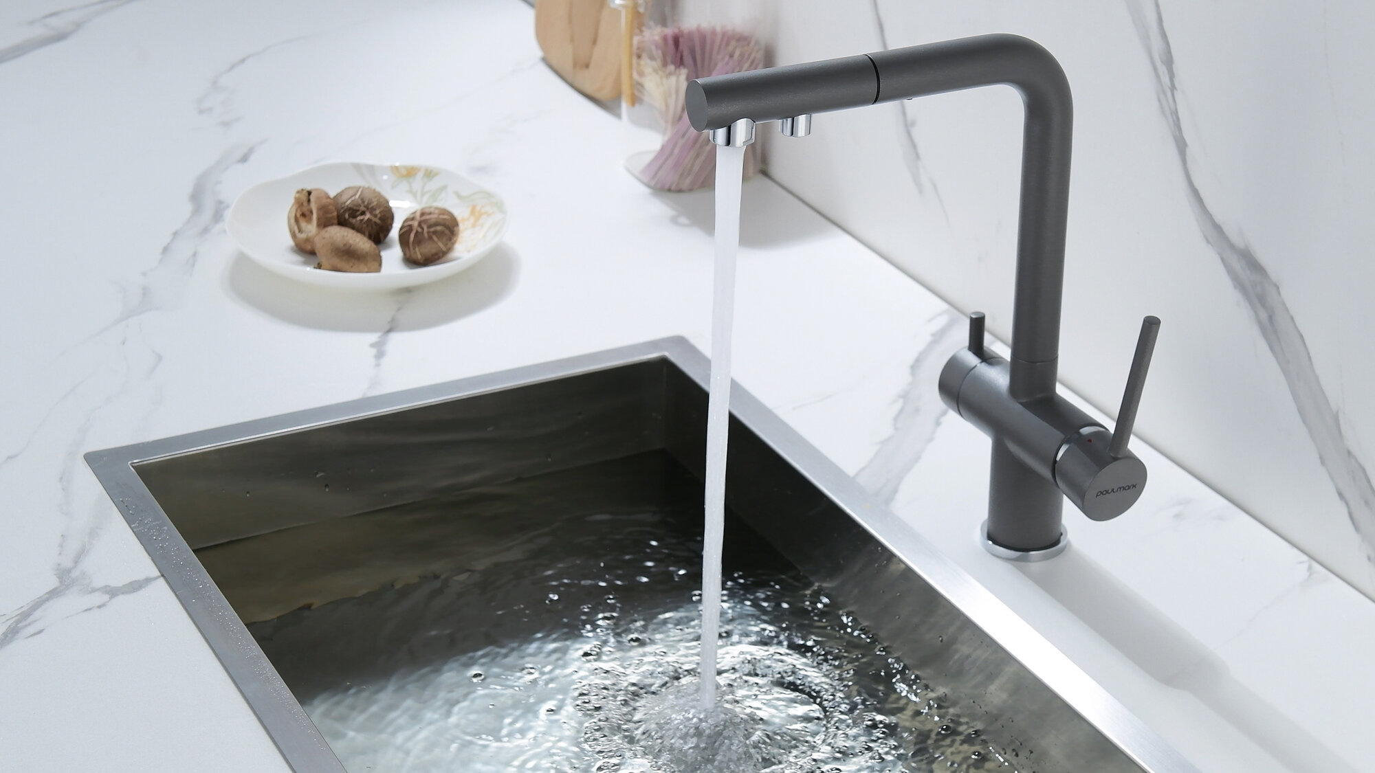 СохранитьКухонный смеситель с гибким выдвижным изливом Paulmark SERPENTINE, подключение к системе фильтрации воды по отдельному каналу, Г-образный, латунь, на мойку / столешницу, серый металлик, Se213222-GRM интересное: