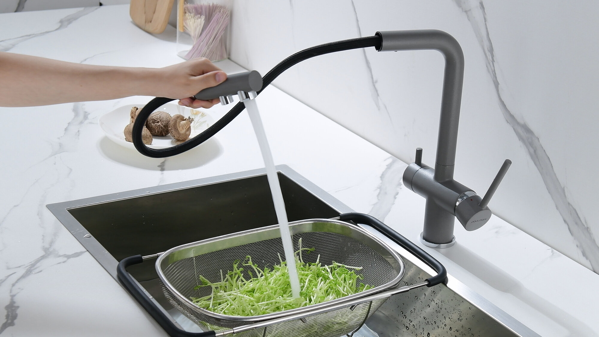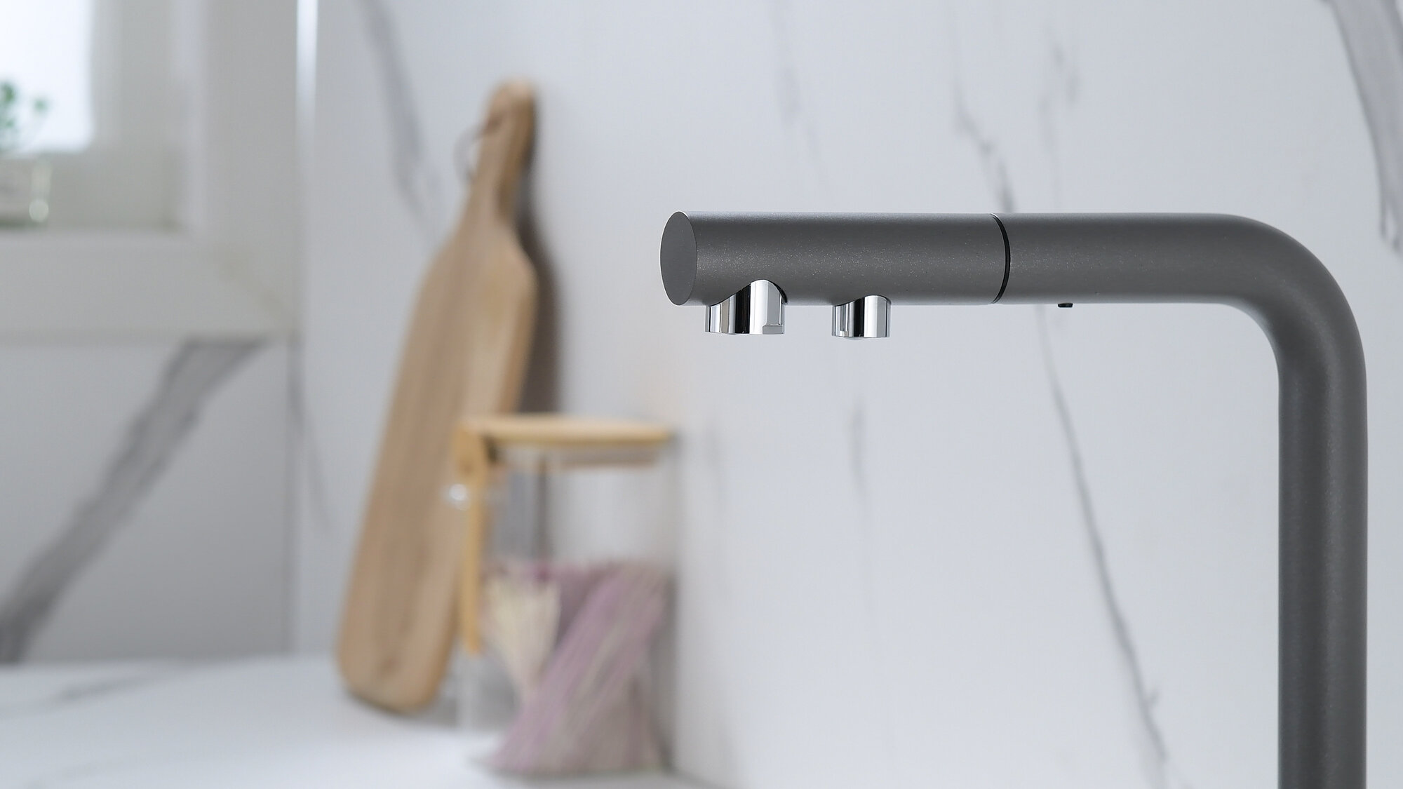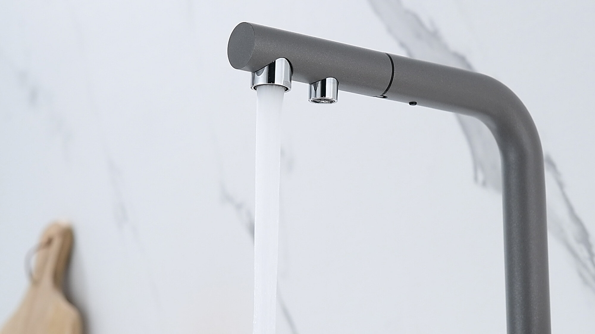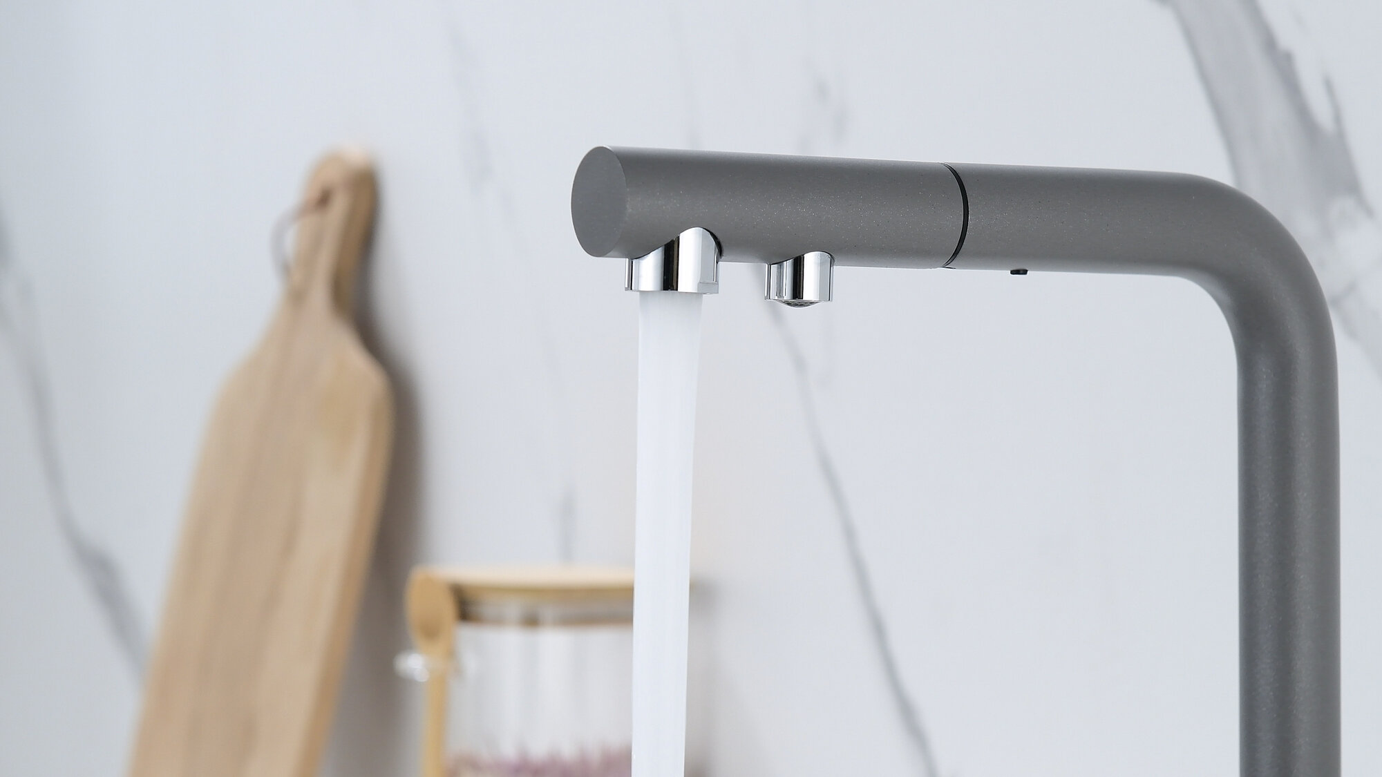 Кухонный смеситель с гибким выдвижным изливом Paulmark SERPENTINE, подключение к системе фильтрации воды по отдельному каналу, Г-образный, латунь, на мойку / столешницу, серый, Se213222-GR