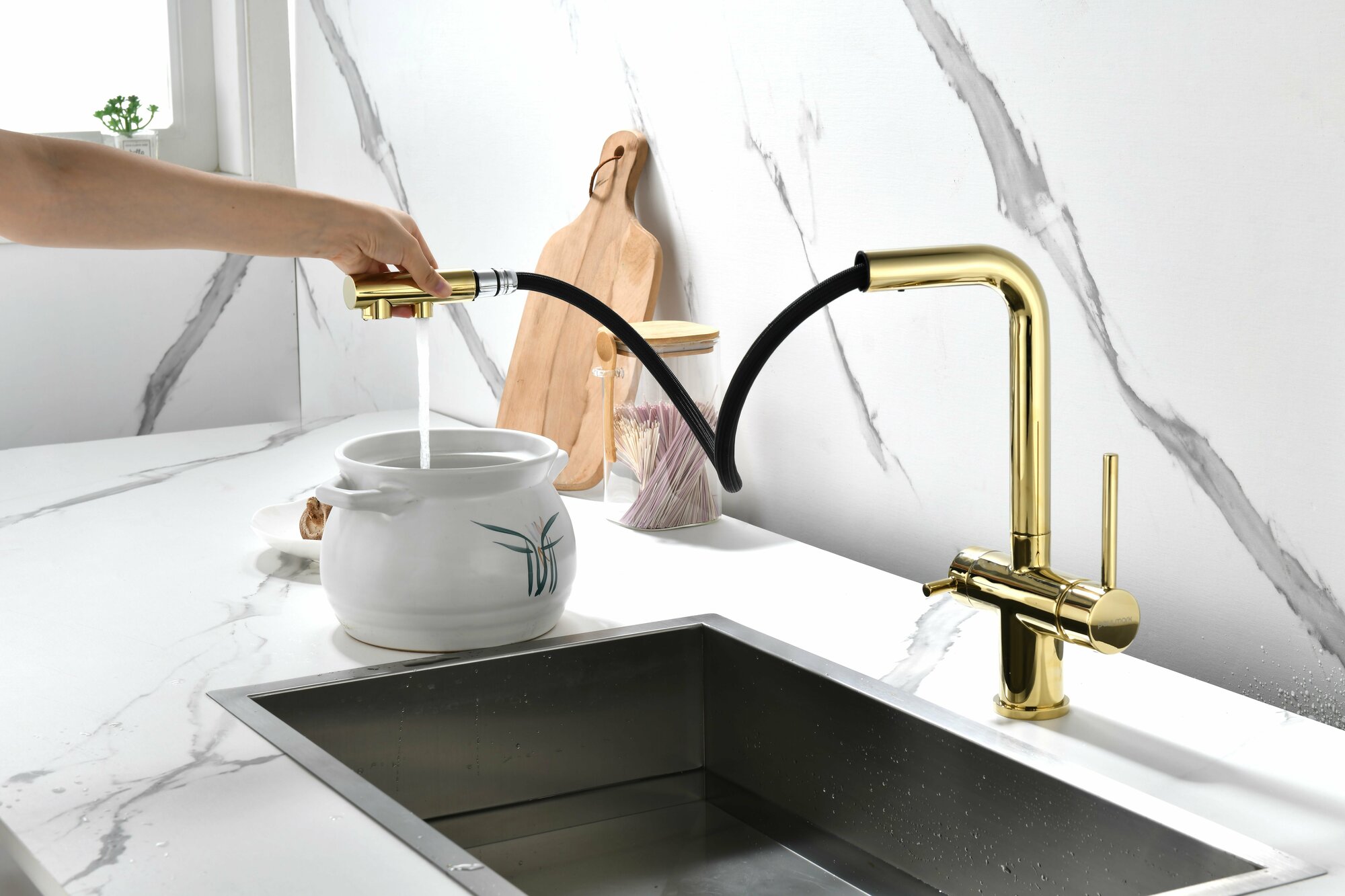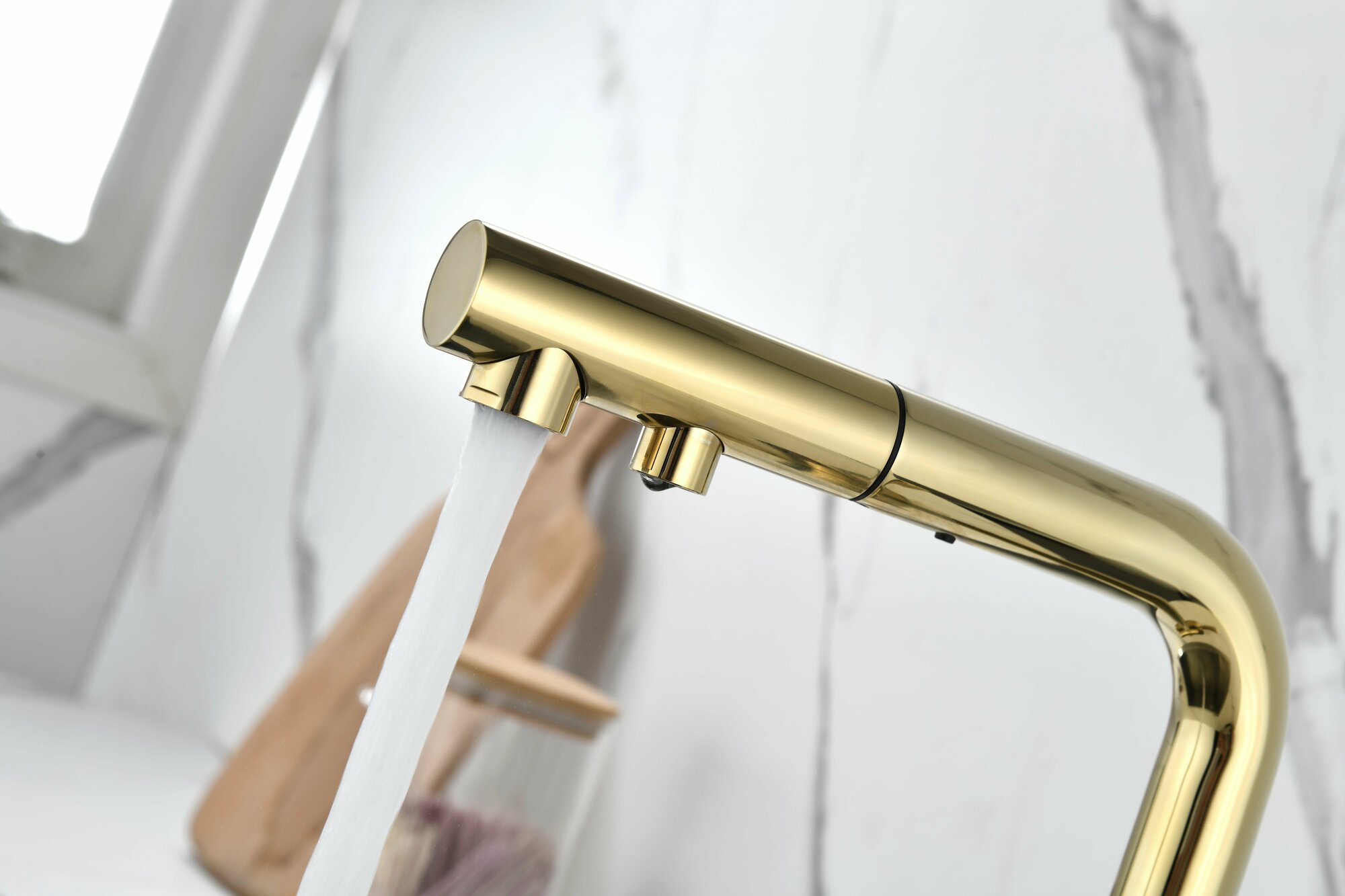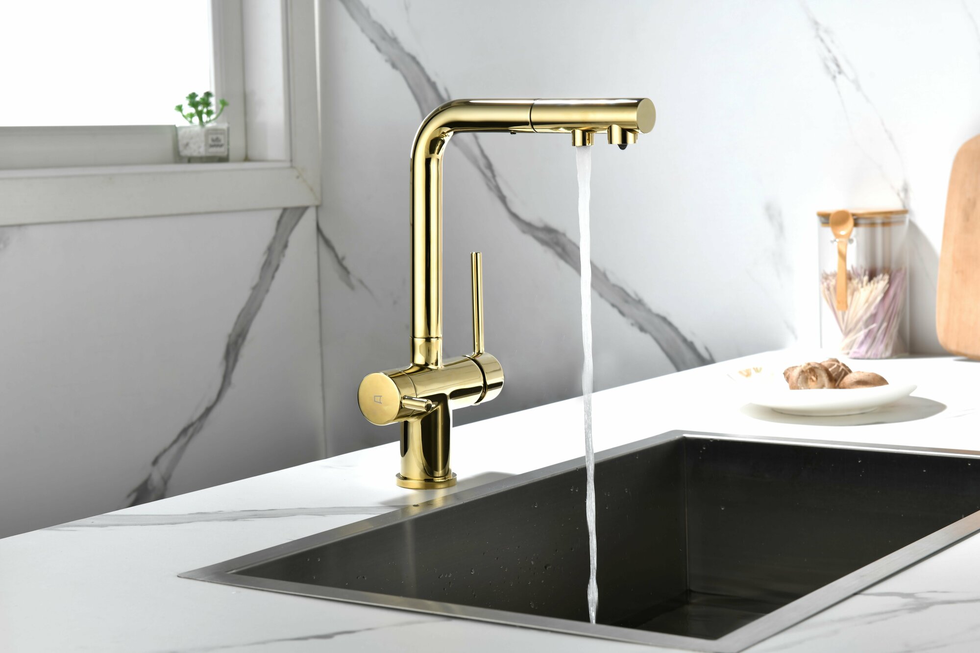 СохранитьКухонный смеситель с гибким выдвижным изливом Paulmark SERPENTINE, подключение к системе фильтрации воды по отдельному каналу, Г-образный, латунь, на мойку / столешницу, золото, Se213222-G интересное: