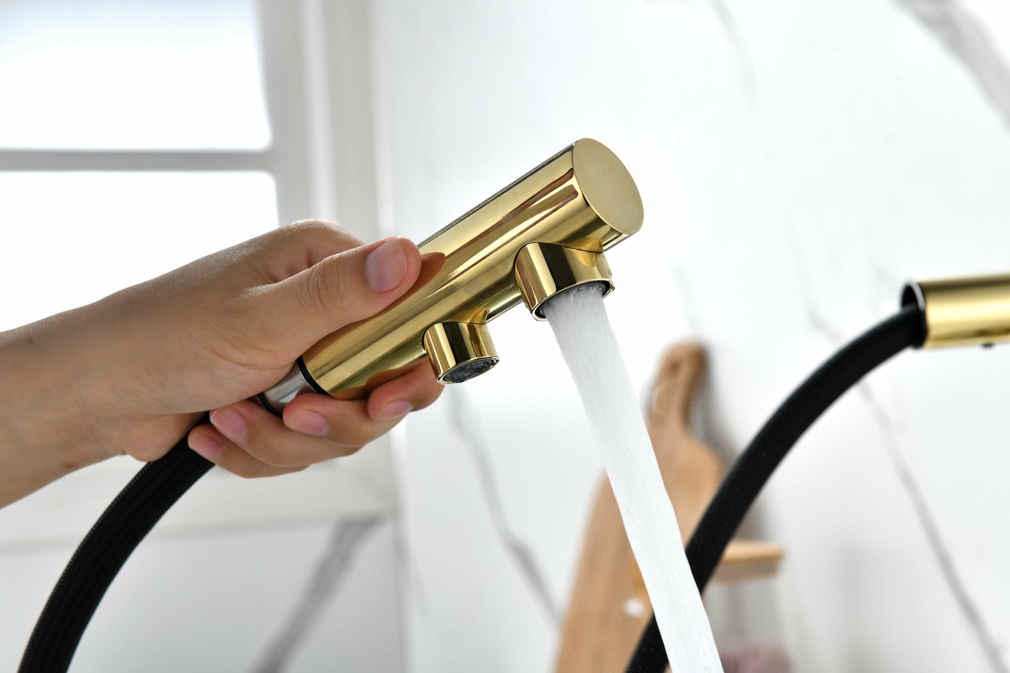 Купить Кухонный смеситель с гибким выдвижным изливом Paulmark SERPENTINE, подключение к системе фильтрации воды по отдельному каналу, Г-образный, латунь, на мойку / столешницу, золото, Se213222-G