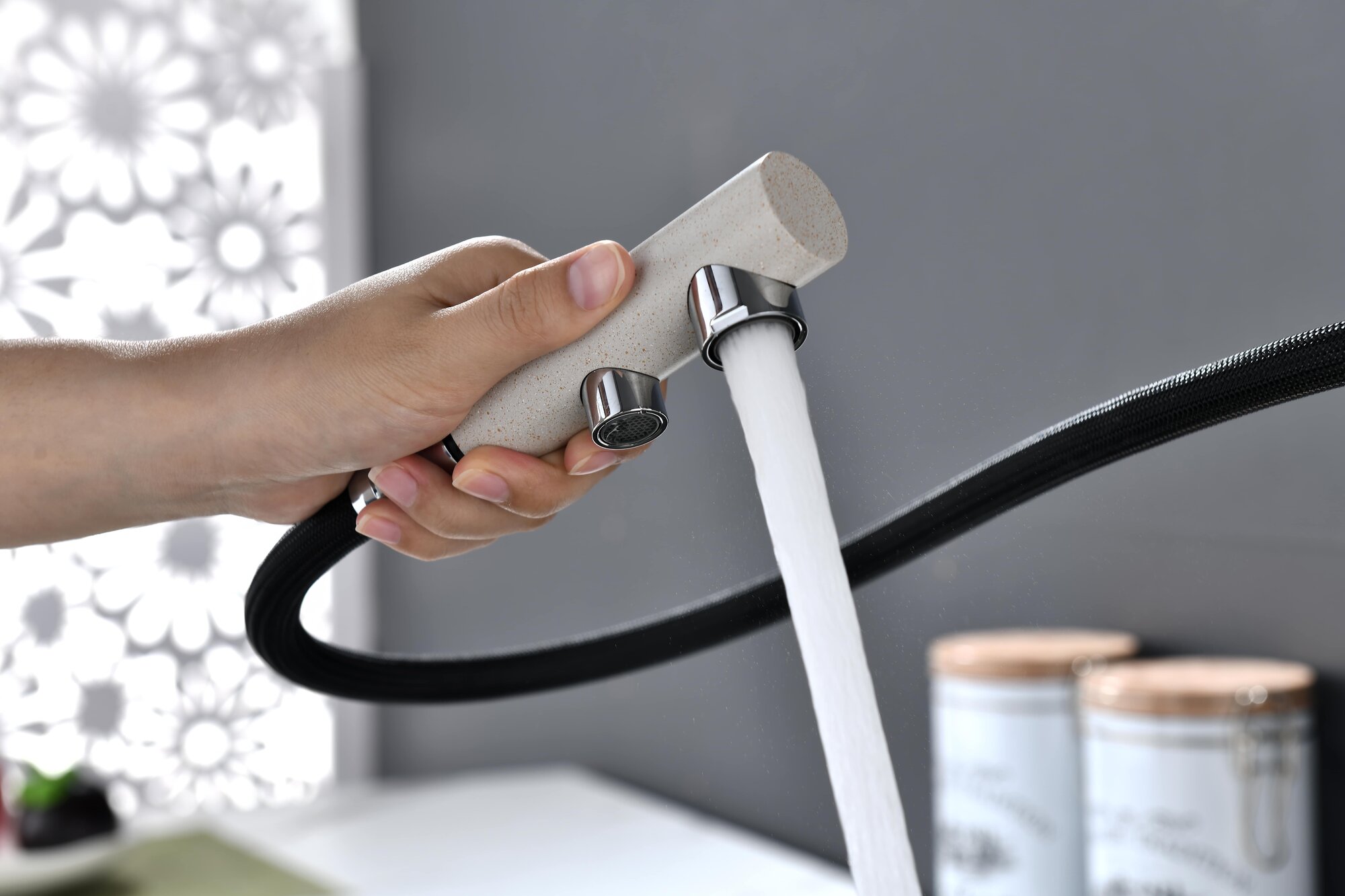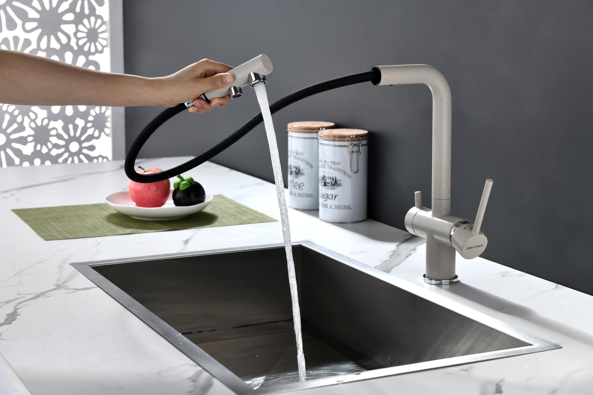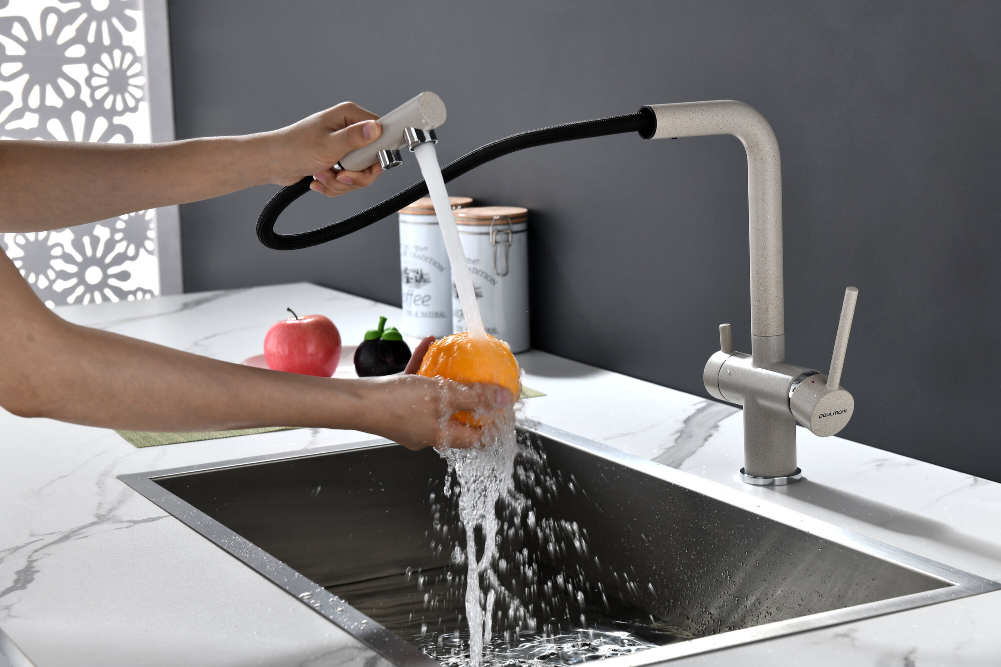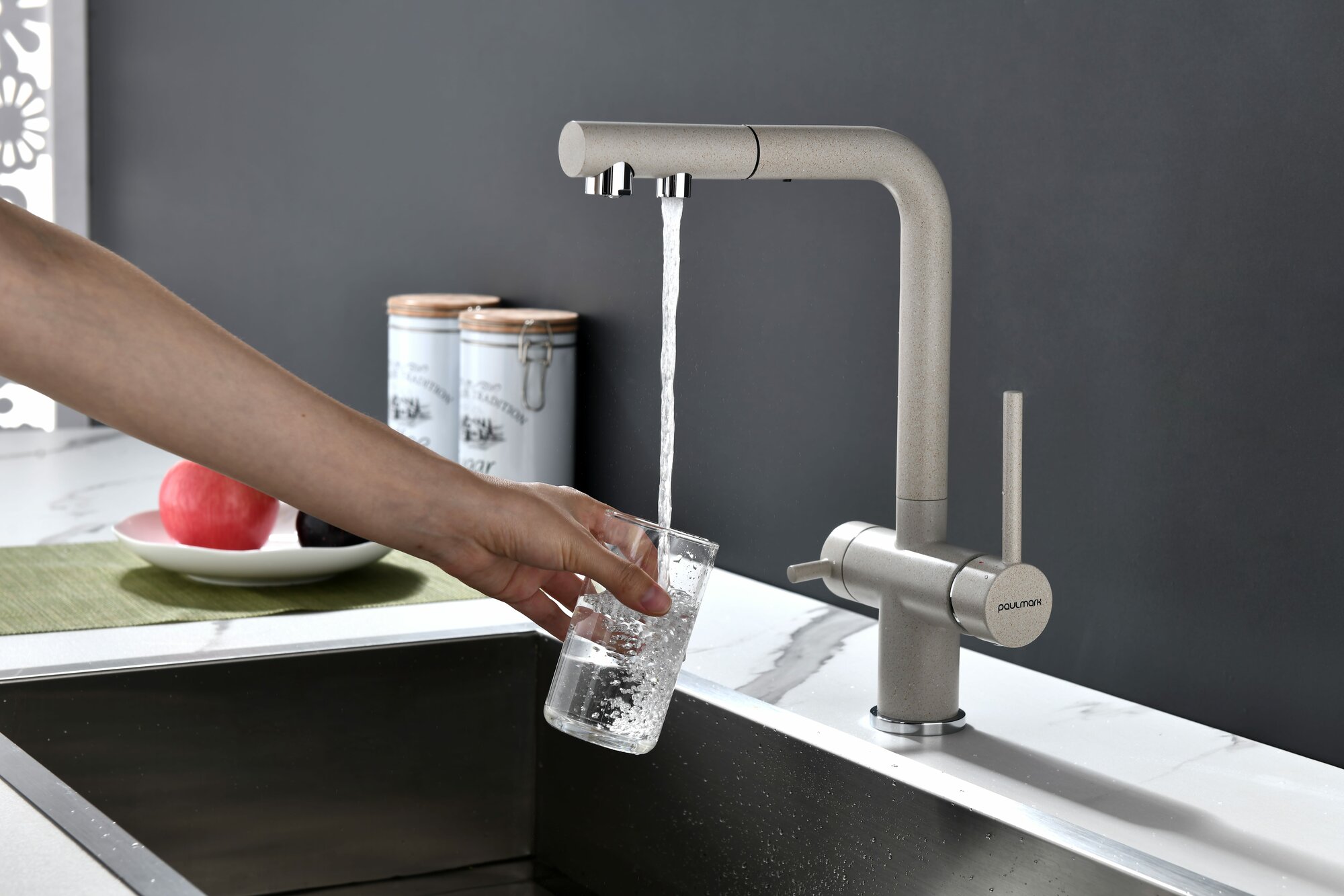 Кухонный смеситель с гибким выдвижным изливом Paulmark SERPENTINE, подключение к системе фильтрации воды по отдельному каналу, Г-образный, латунь, на мойку / столешницу, бежевый, Se213222-BE