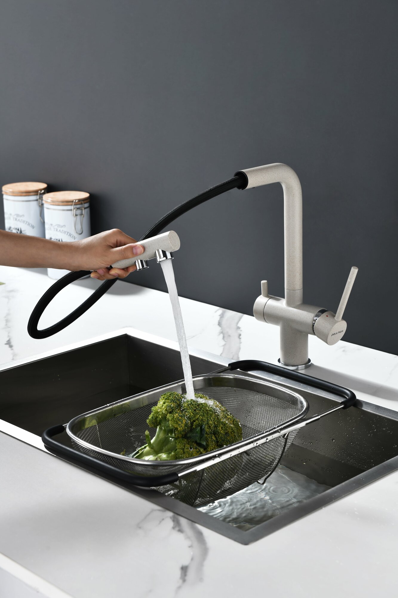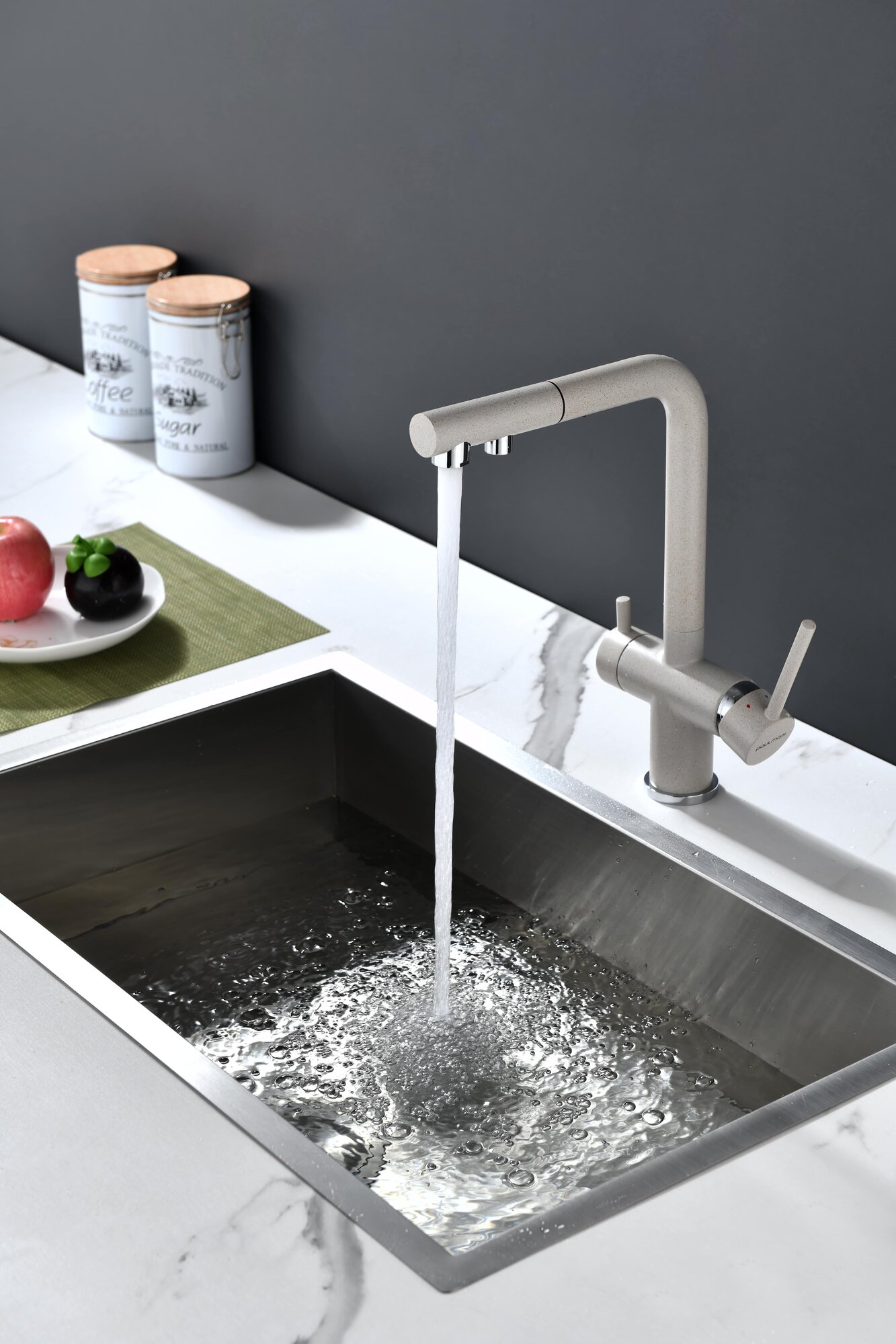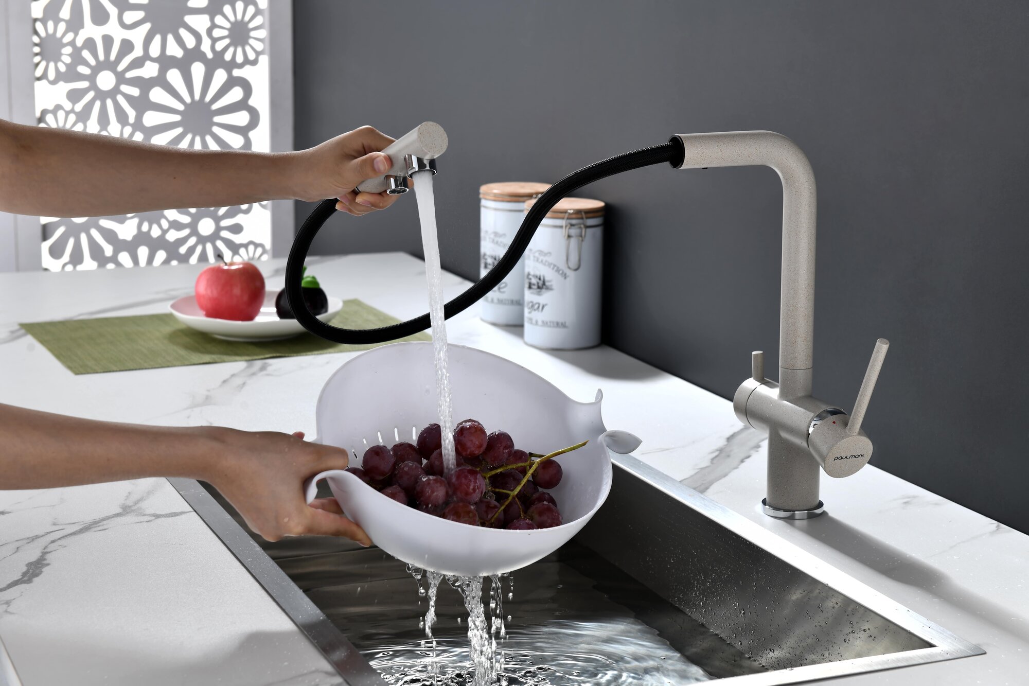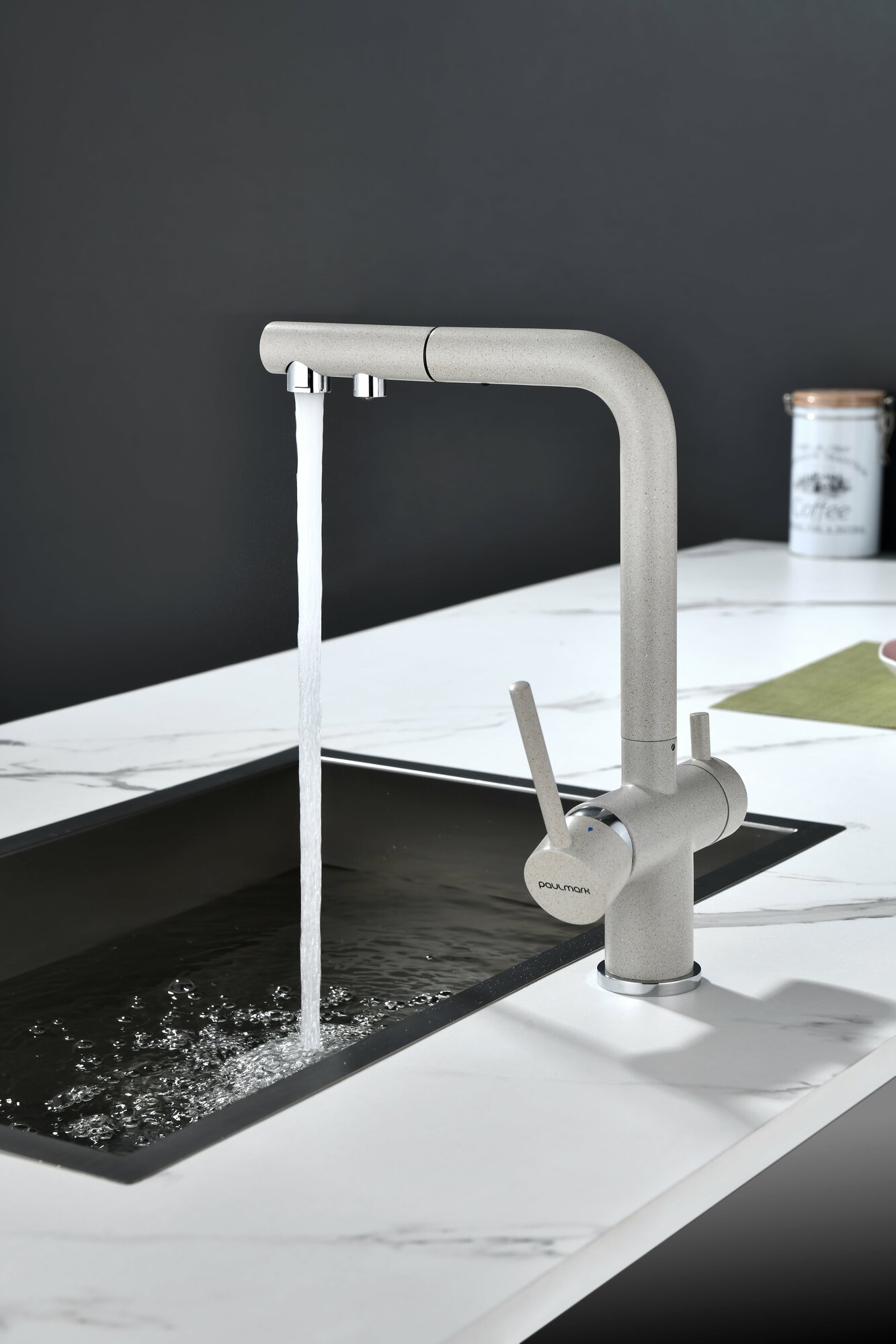 Кухонный смеситель с гибким выдвижным изливом Paulmark SERPENTINE, подключение к системе фильтрации воды по отдельному каналу, Г-образный, латунь, на мойку / столешницу, серый, Se213222-GR