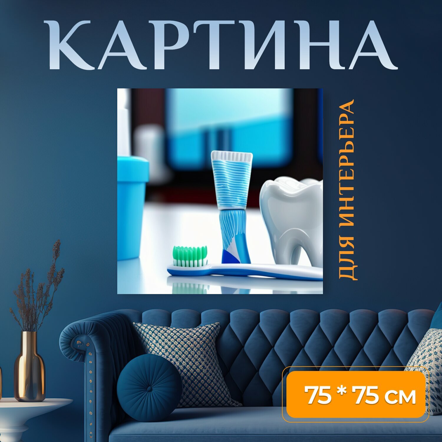 Купить Картина на холсте в стоматологию "Зубная щетка и паста на фоне стоматологического кабинета , " на подрамнике 75х75 см. для интерьера