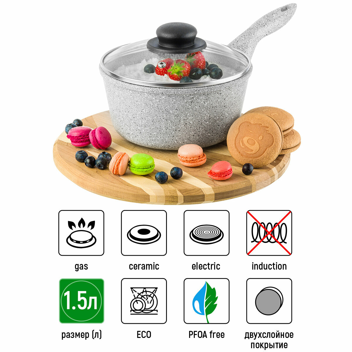 Ковш 1,5 л Elan Gallery гармония вкуса Серый агат ковшик кухонный с крышкой толстостенный из литого алюминия с двухслойным антипригарным покрытием с несъемной ручкой Идеальный подарок на Новый год Рождество День Рождения и 8 марта