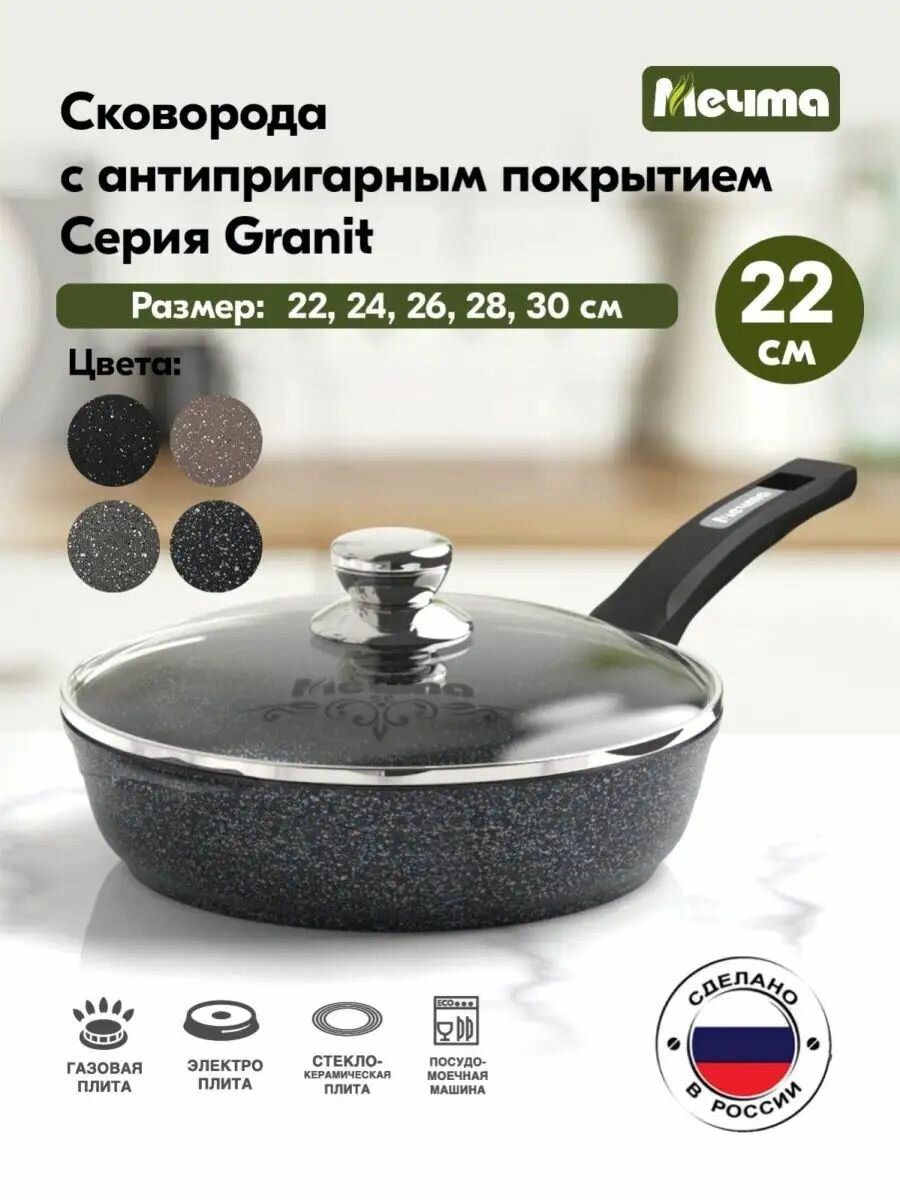 Сковорода Мечта 22 см Гранит с антипригарным покрытием с несъемной ручкой и крышкой, НЕ индукционная