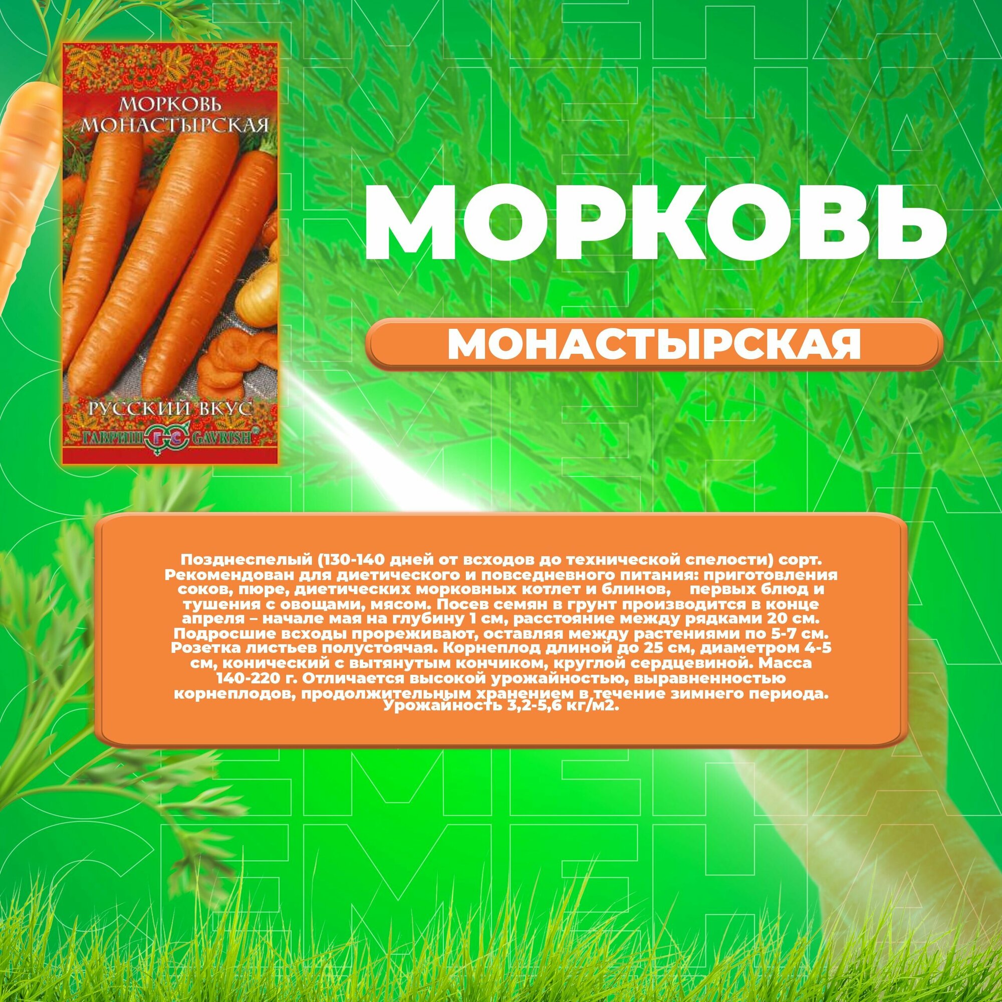 Ниже Вы можете прочитать отзывы на Семена Морковь Монастырская 2г Поздние (Гавриш) Русский вкус, ознакомится с подробными характеристиками, посмотреть интересные обзоры и фотографии на Семена Морковь Монастырская 2г Поздние (Гавриш) Русский вкус.
