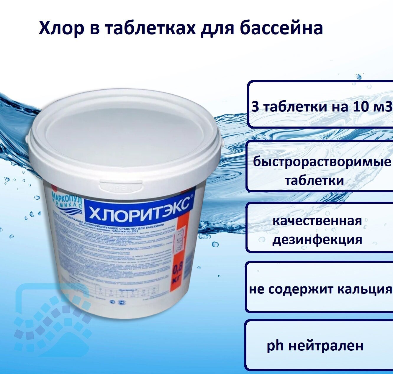 Маркопул Кемиклс Дезинфицирующее средство "Хлоритэкс" для воды в бассейне, 800 гр