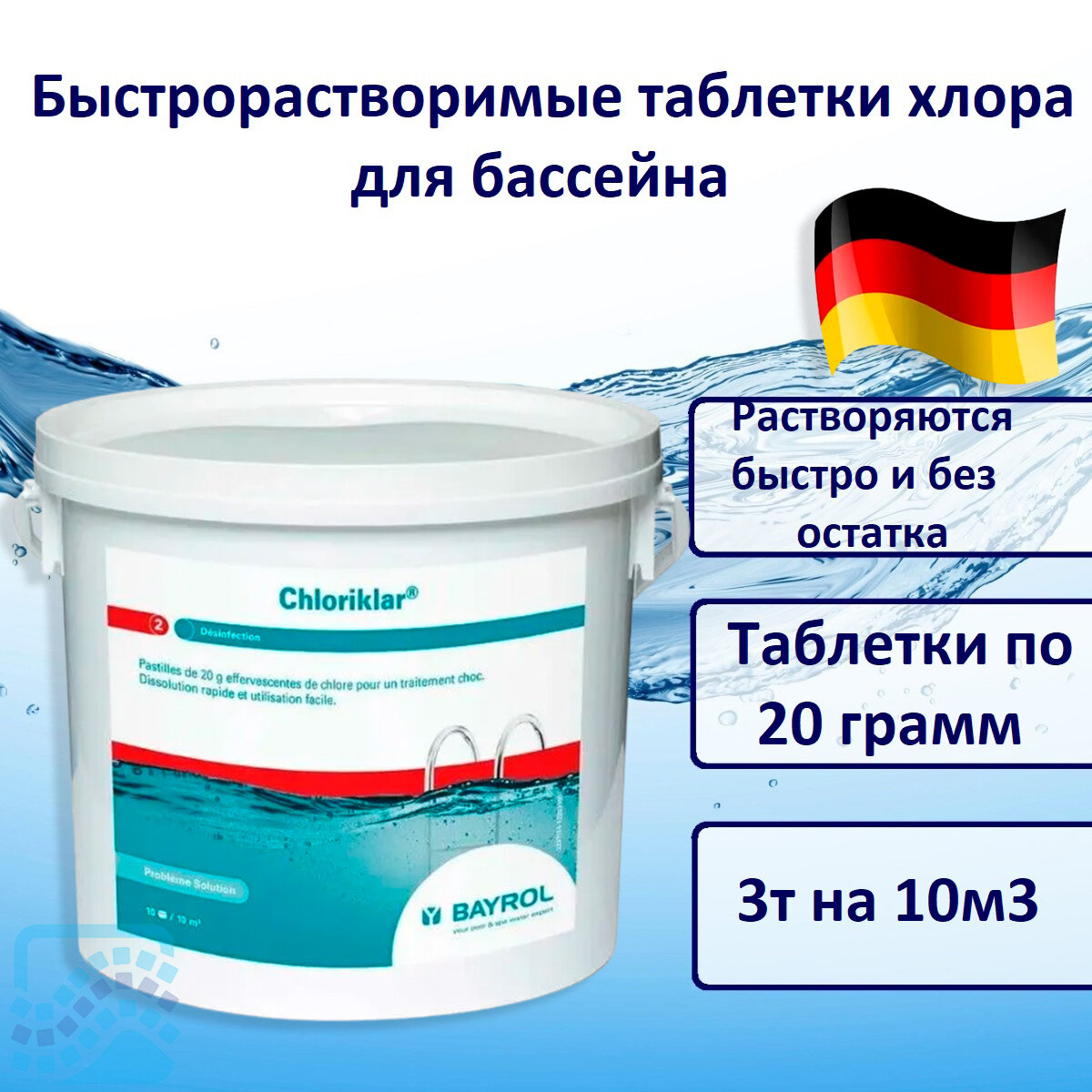 Хлориклар (Chloriklar) 20 Bayrol 5 кг l быстро растворимые маленькие хлорные таблетки l химия для бассейна