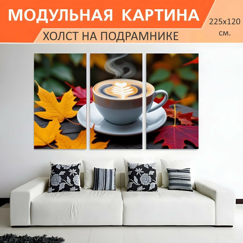 Купить Модульная картина на холсте "Чашка кофе с уютом среди осенних листв , " триптих на подрамнике 225х120 см. для интерьера