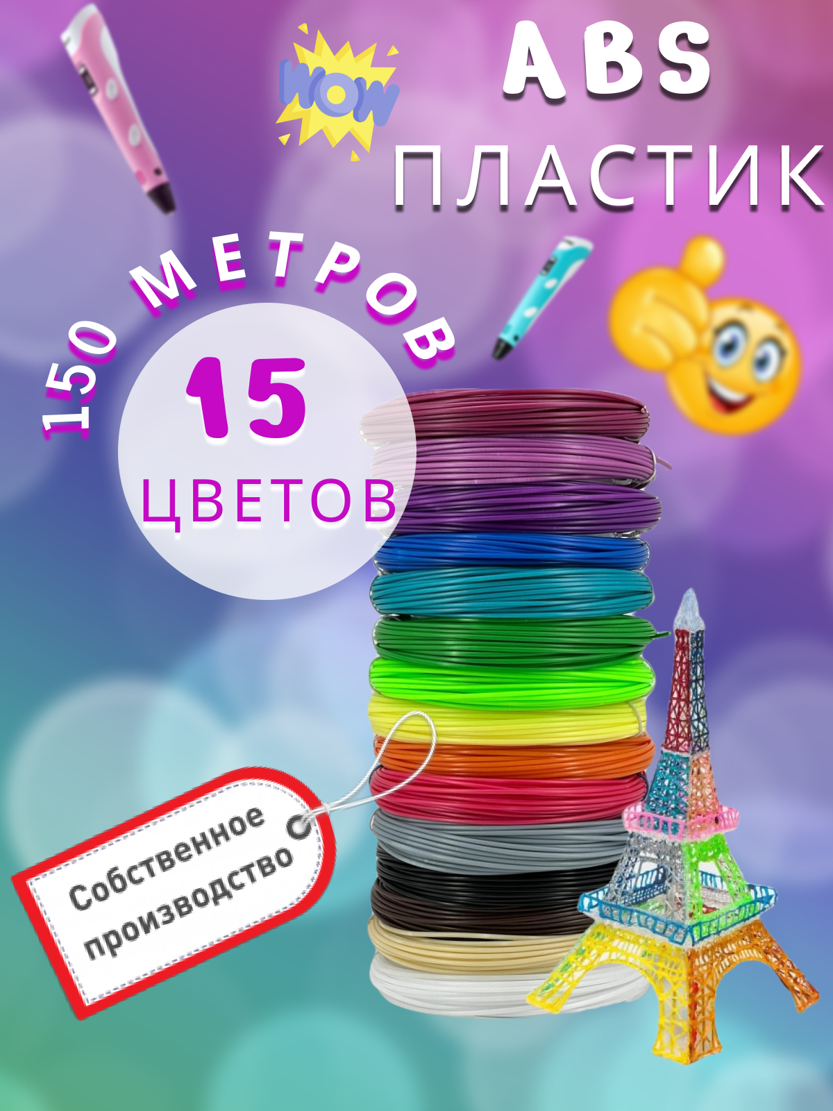 Пластик для 3D ручки "НИТ", набор ABS - 15 цветов по 10м (150 метров) интересное: