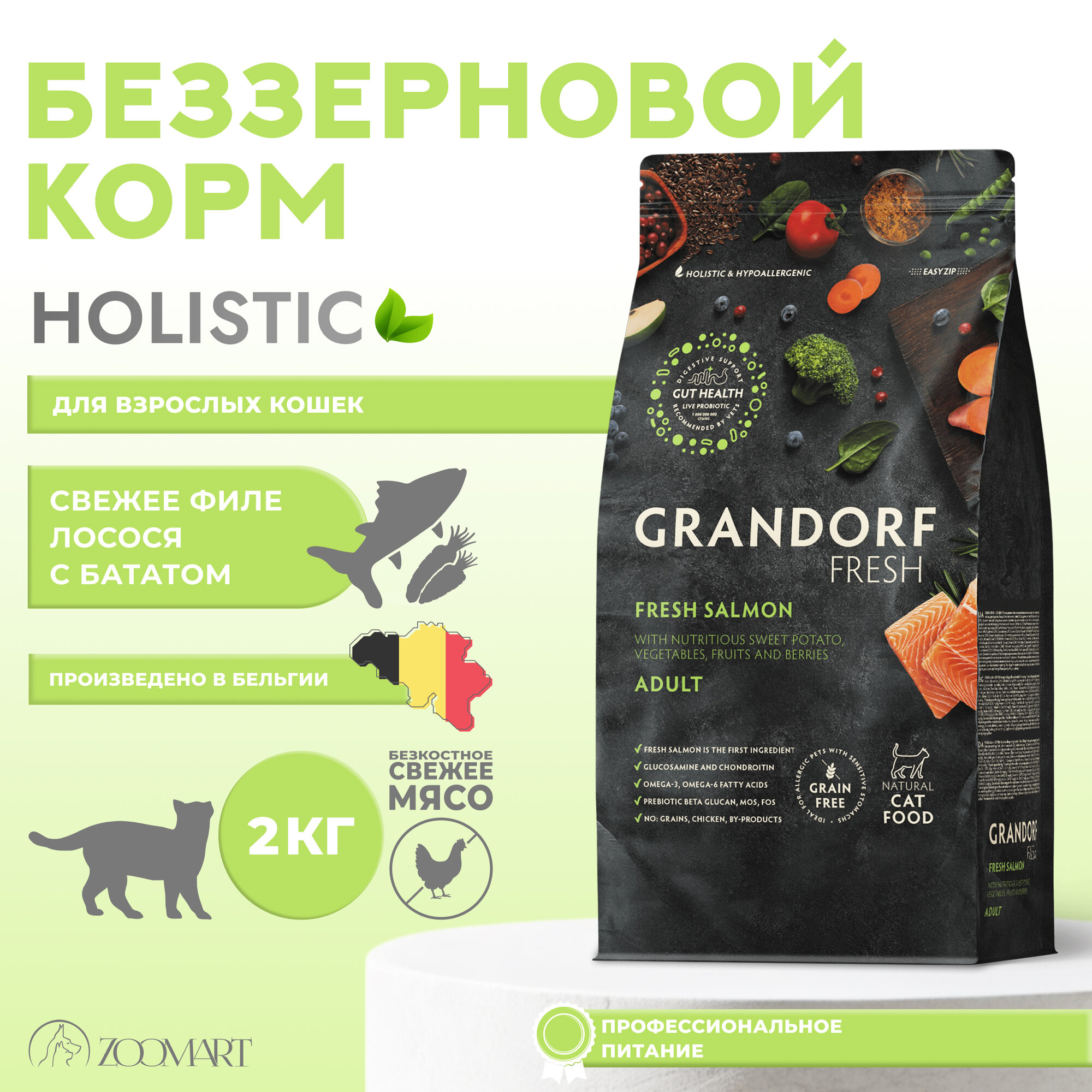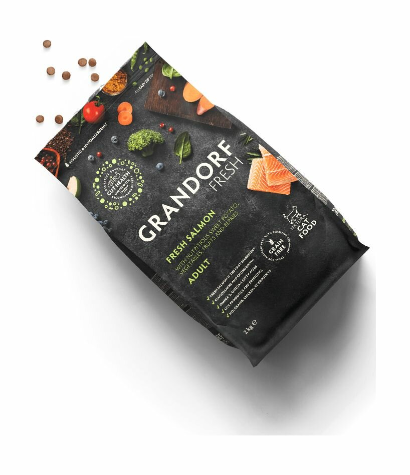 Сухой беззерновой корм Grandorf Fresh свежее филе лосося с бататом, с живыми пробиотиками для стерилизованных ИЛИ пожилых кошек, 2 кг
