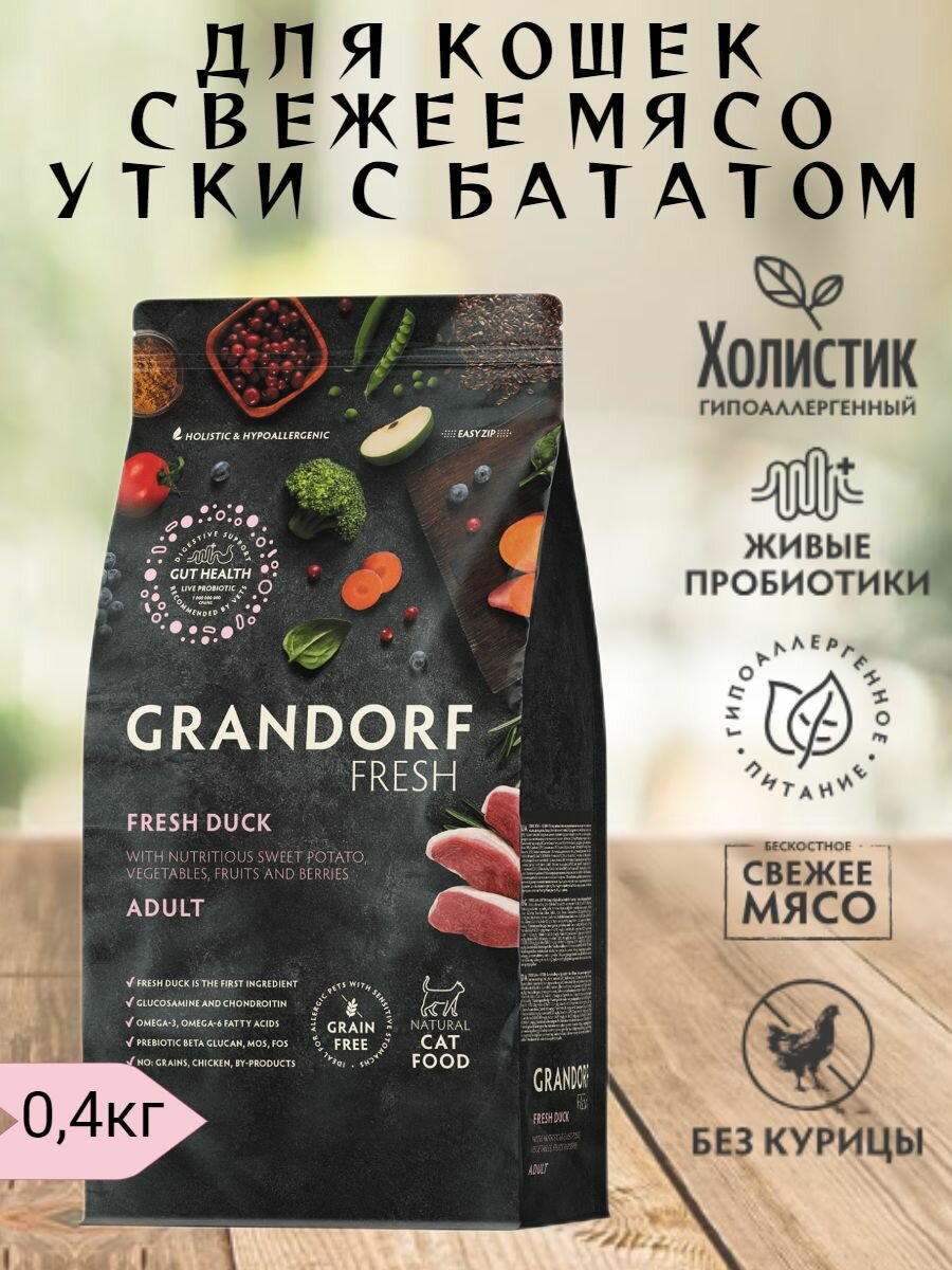 Сухой беззерновой корм для взрослых кошек грандорф фреш (GRANDORF FRESH). Утка, Батат - 400 гр