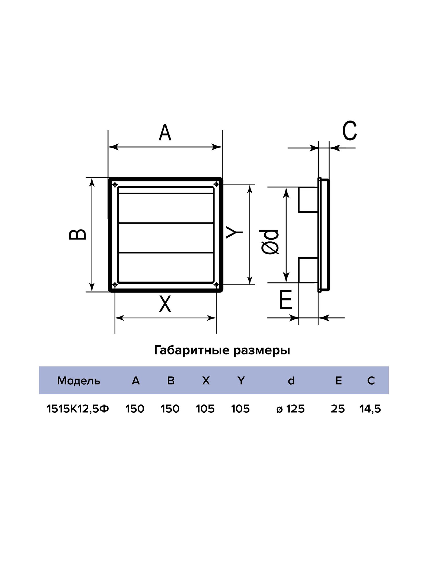 1515К12,5Ф, Решетка приточно-вытяжная с гравитационными жалюзи 150х150 с фланцем D125,ASA, бел.