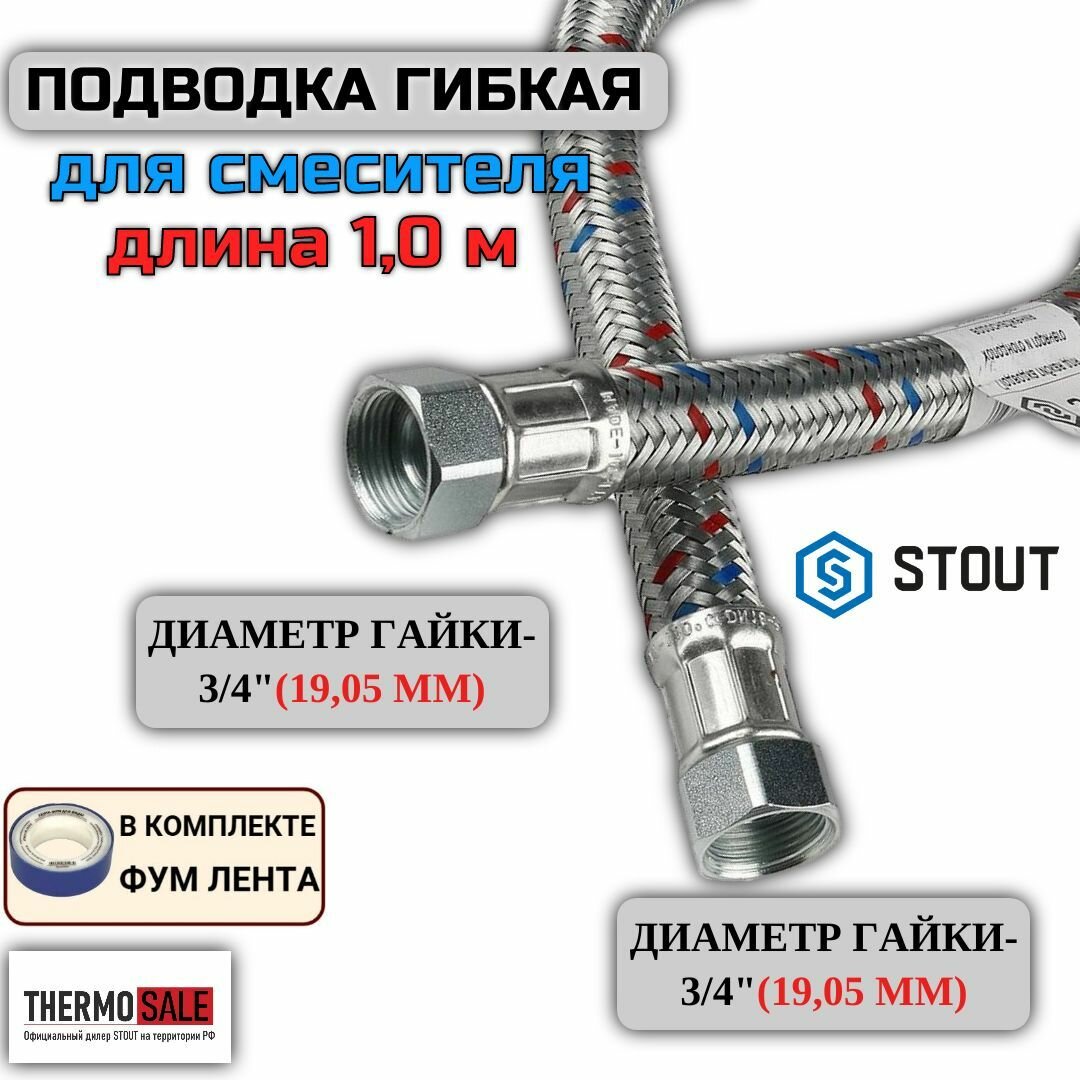 STOUT Гибкая подводка для воды ВР 3/4 х ВР 3/4, длина 1000 мм SHF-0310-182020 RG008S8TKGALIG
