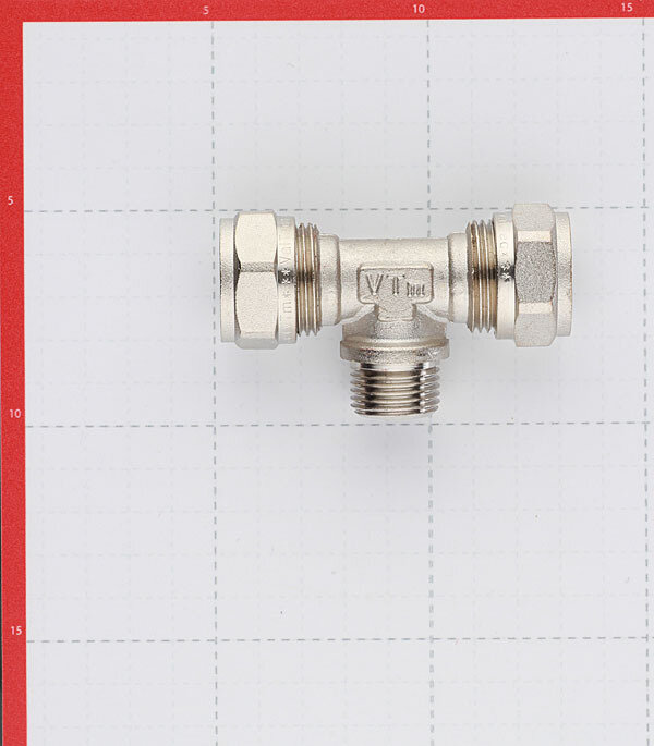Тройник обжимной 20 мм х 3/4" НР х 20 мм для металлопластиковых труб 20(2,0) VALTEC / Латунный фитинг под обжим с переходом на наружную резьбу ДУ20, арт. VTm.333.N.200520