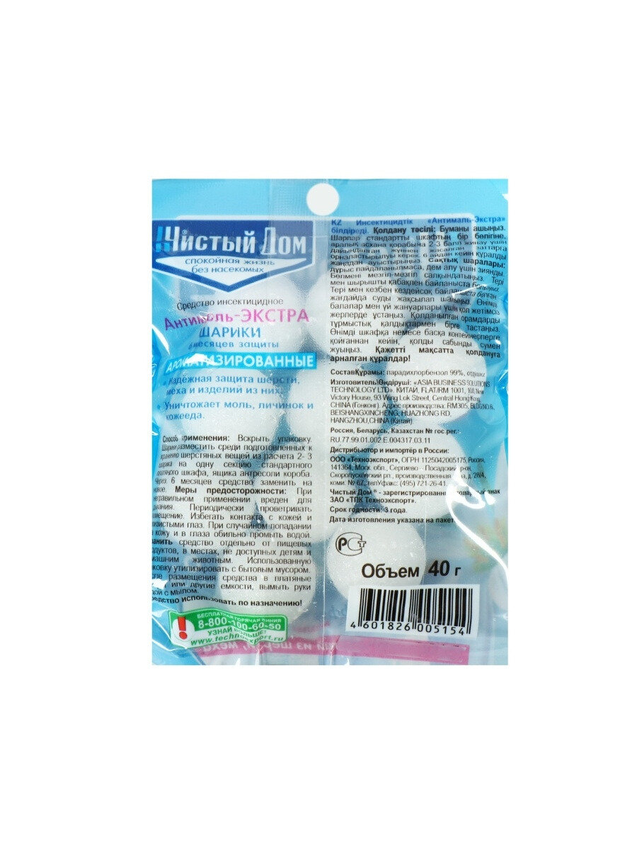 Шарики от моли "Чистый дом" Антимоль Экстра, пакет, 40 г(2 шт.)