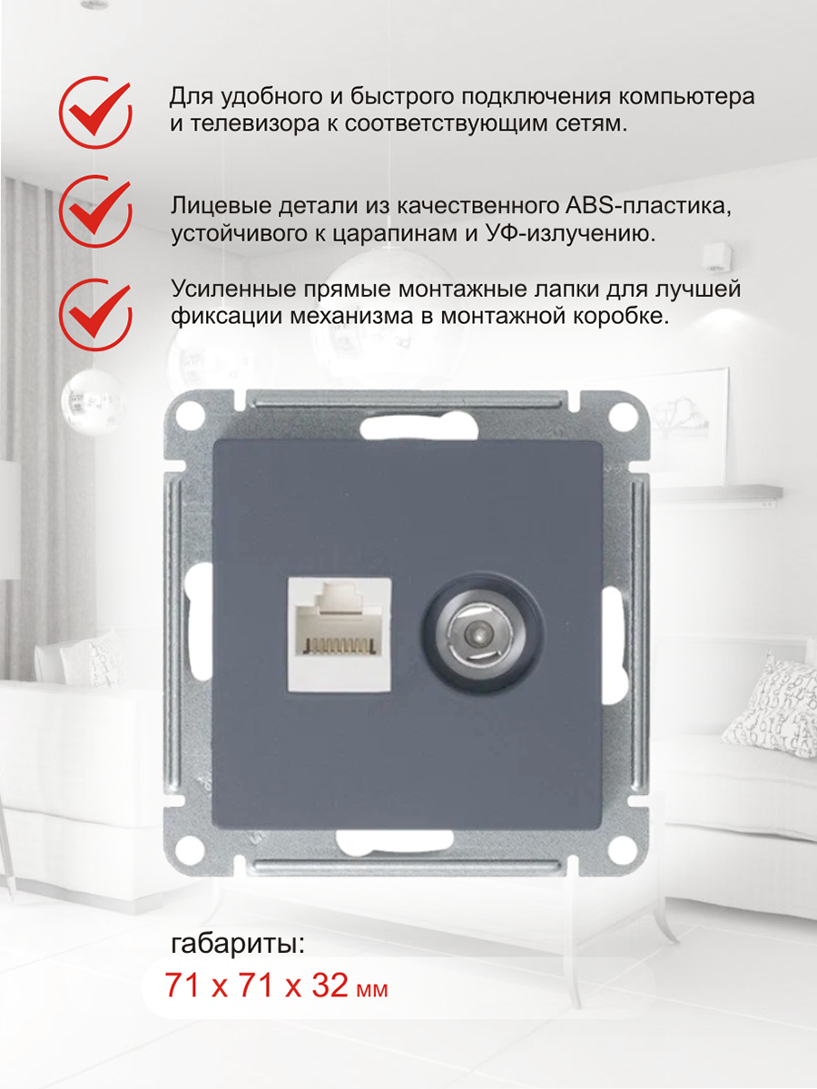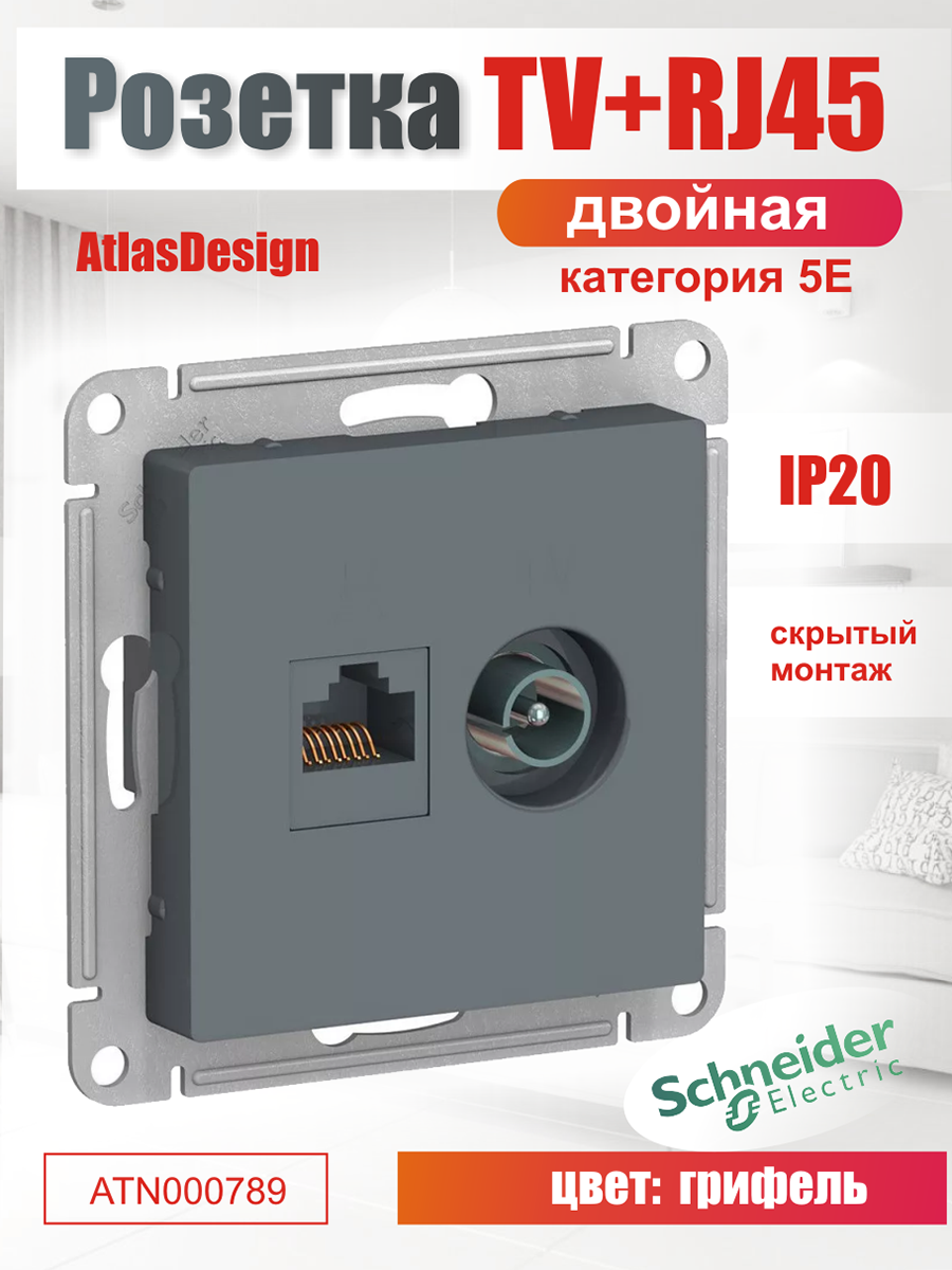 Купить Розетка ATLASDESIGN двойная компьютерная+ТВ RJ45+TV категория 5E механизм грифель