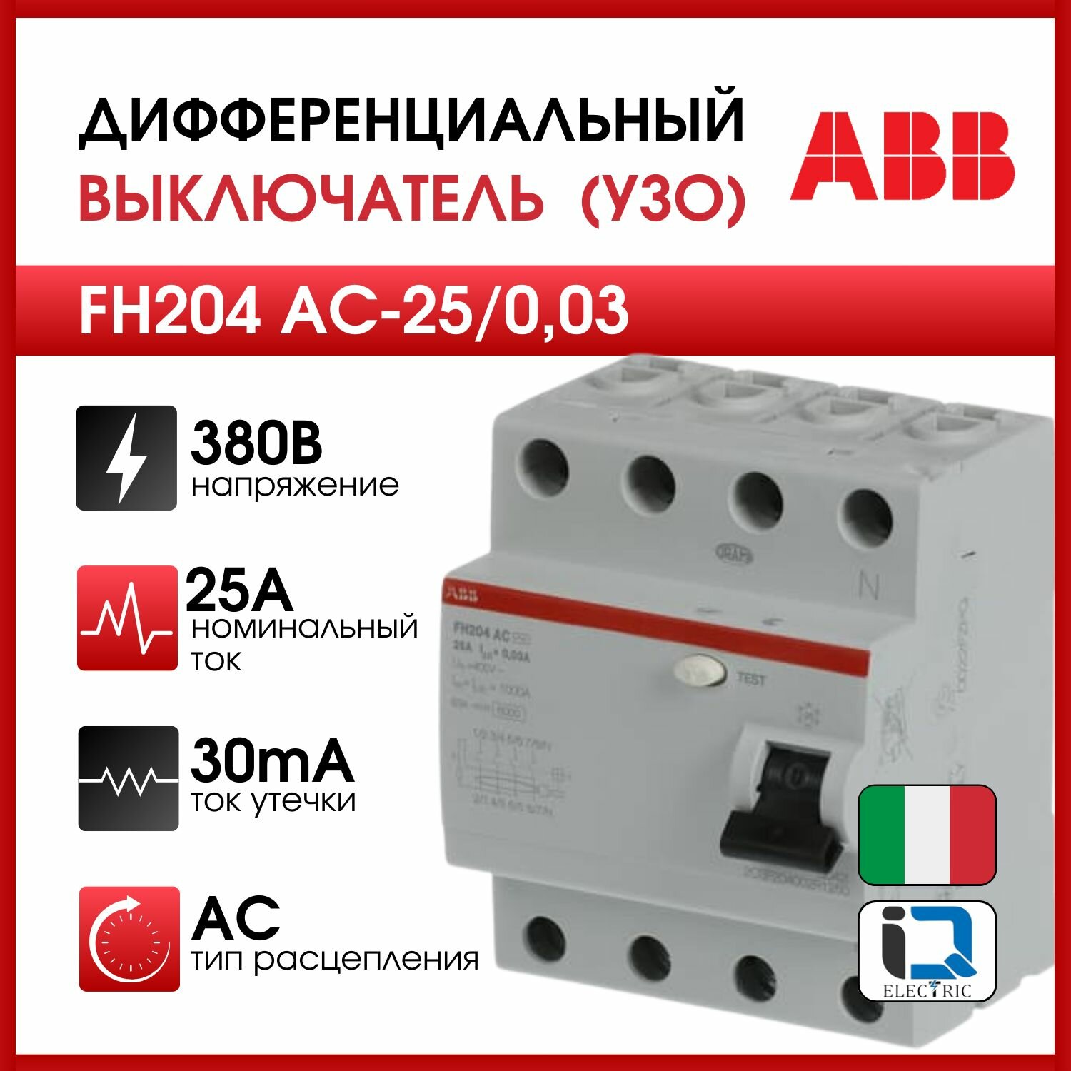 Устройство защитного отключения (УЗО) ABB FH200, 4 полюса, 25A, 30 mA, тип AC, электро-механическое, ширина 4 DIN-модуля