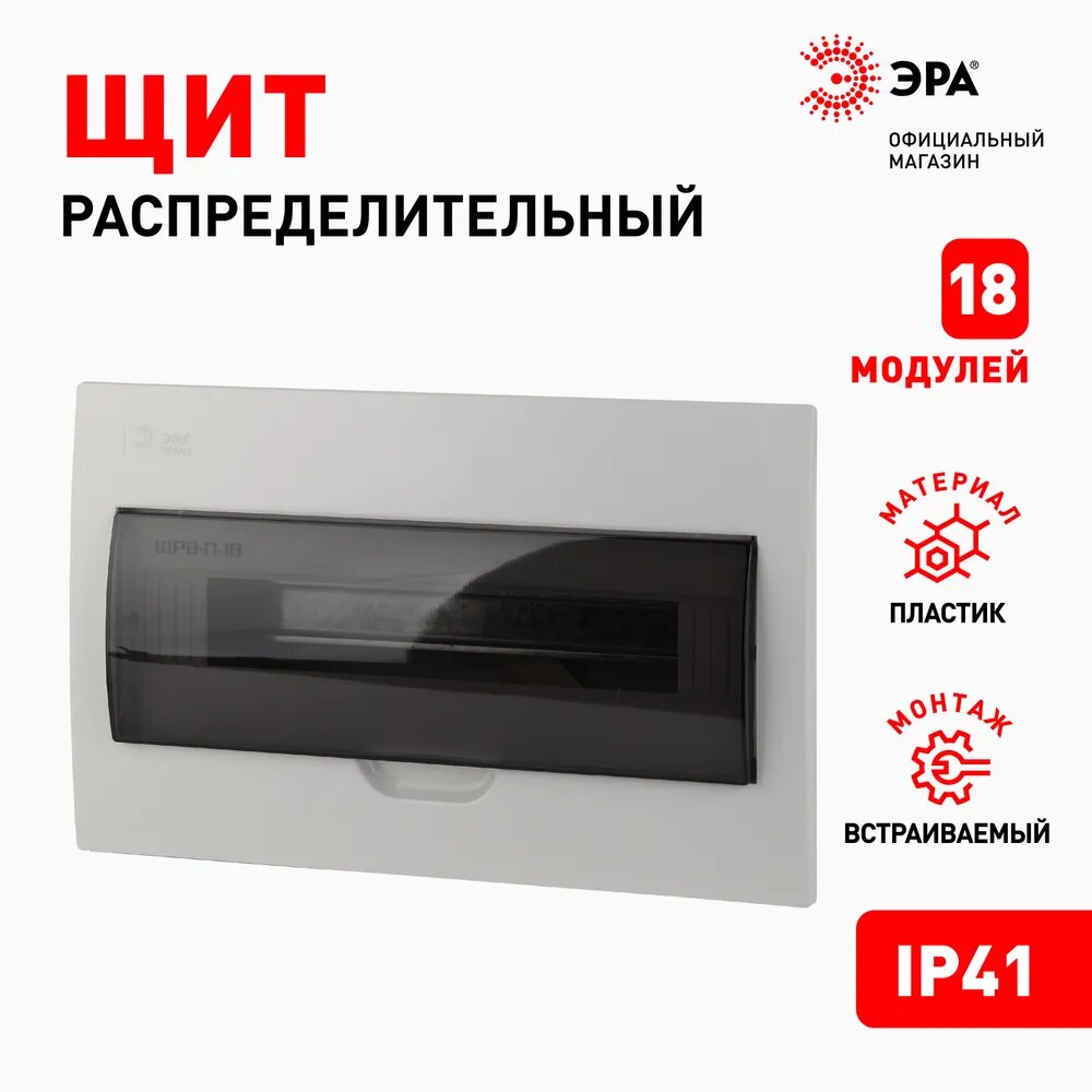 СохранитьЩит распределительный встраиваемый ЭРА ЩРВ-П-18 SIMPLE пластиковый на 18 модулей с дверцей IP41, 395х249х95 мм интересное: