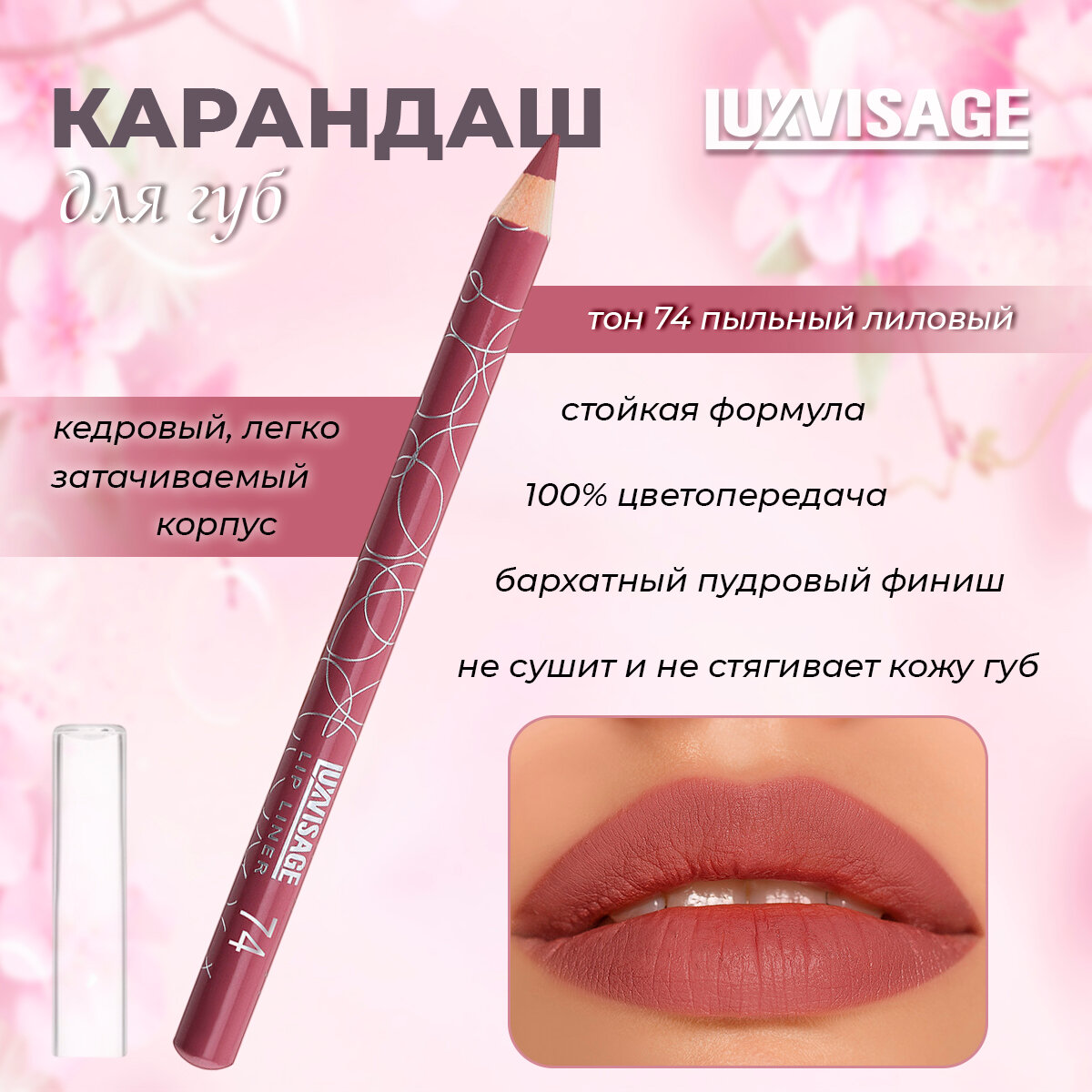 карандаш для губ LUXVISAGE Классический цвет: 74, Пыльный лиловый / 1.75 г