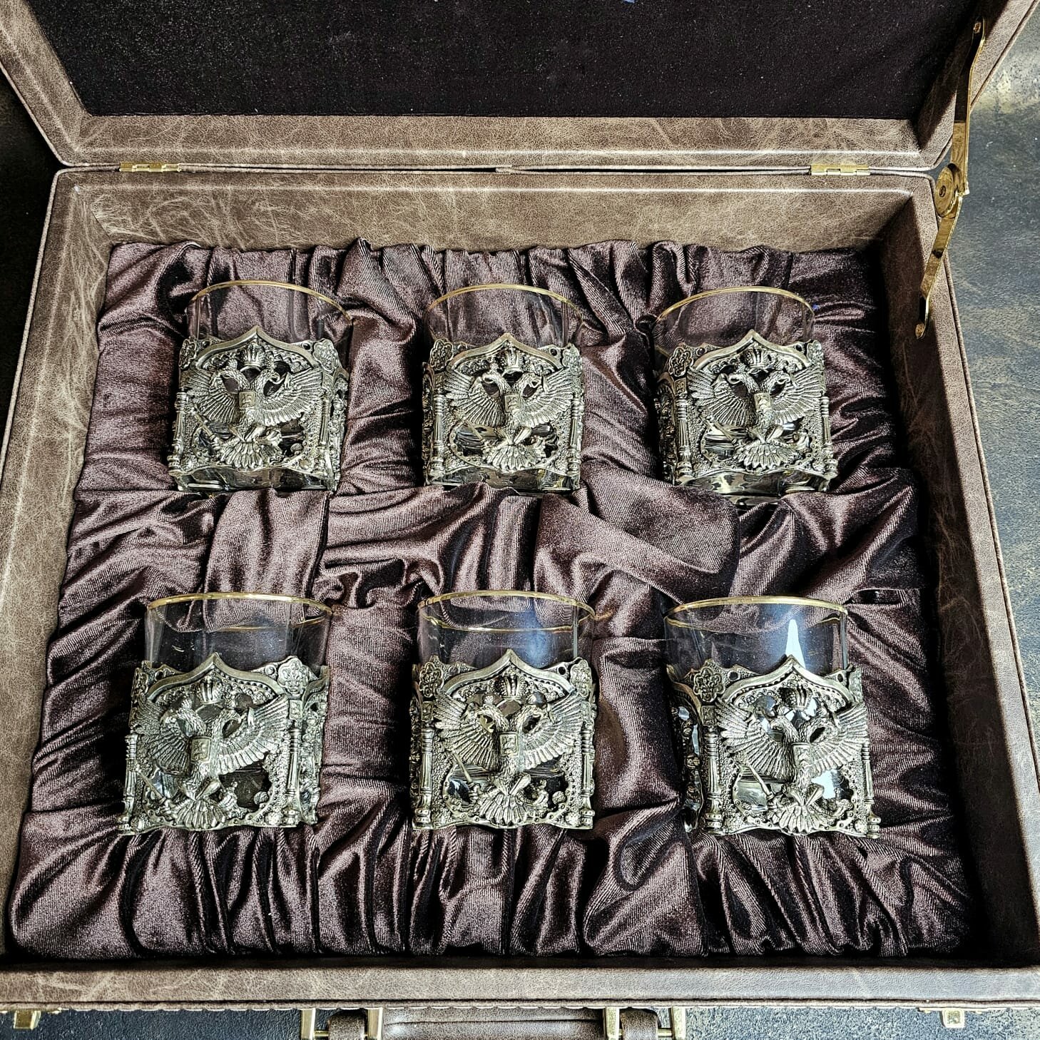 Купить Подарочный набор бокалов для виски герб, 6 стаканов в футляре, художественное литье из бронзы.