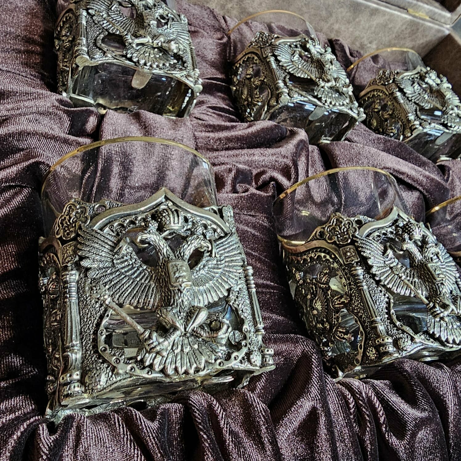 Подарочный набор бокалов для виски герб, 6 стаканов в футляре, художественное литье из бронзы. интересное: