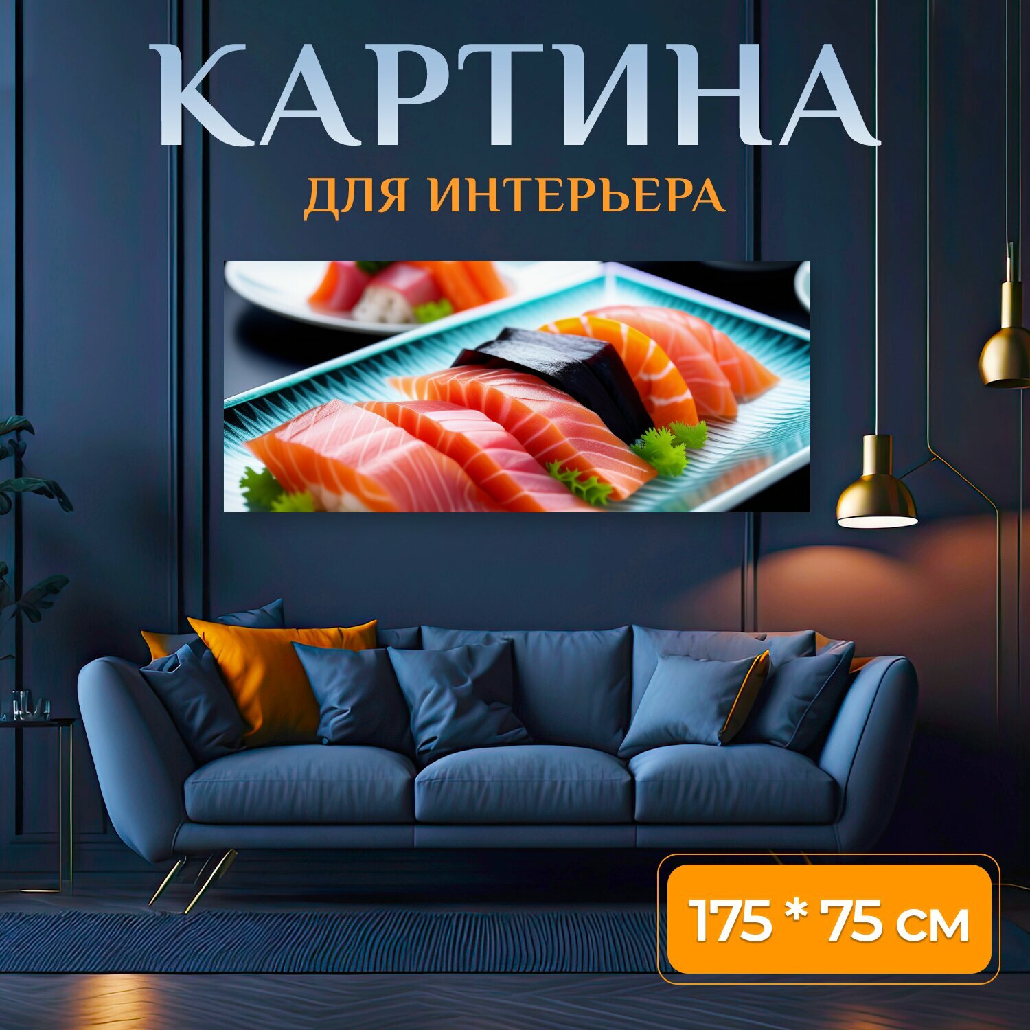 Картина на холсте "Сашими, подаваемое на стеклянных тарелках" на подрамнике 75х40 см. для интерьера