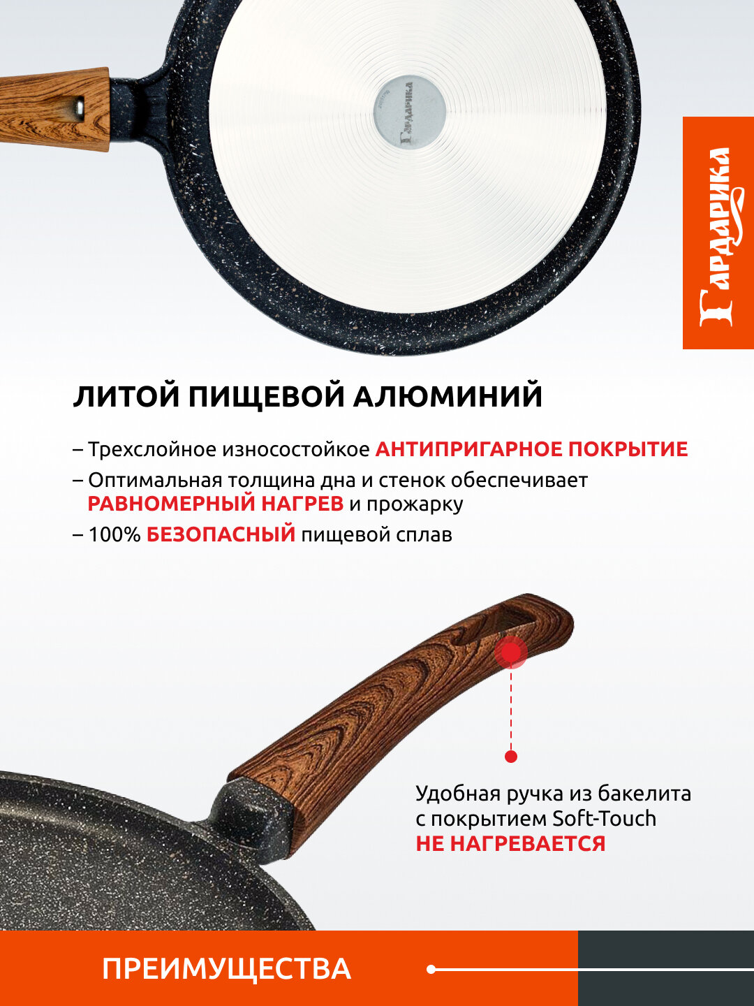 Блинница алюминий, 22 см, антипригарное покрытие, Гардарика, Мегалит 18, 0822-18, бакелитовая ручка, ручка soft-touch